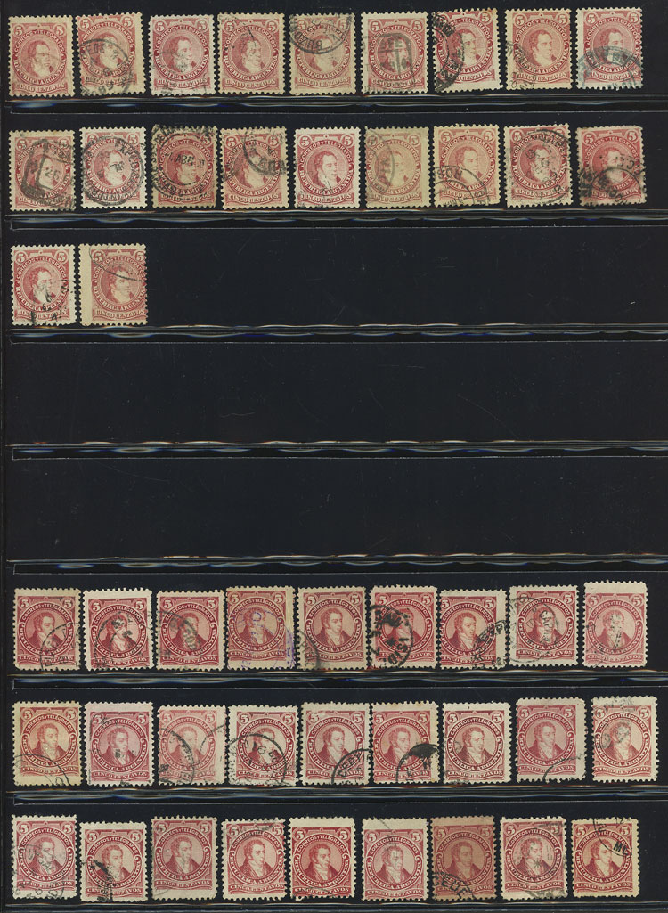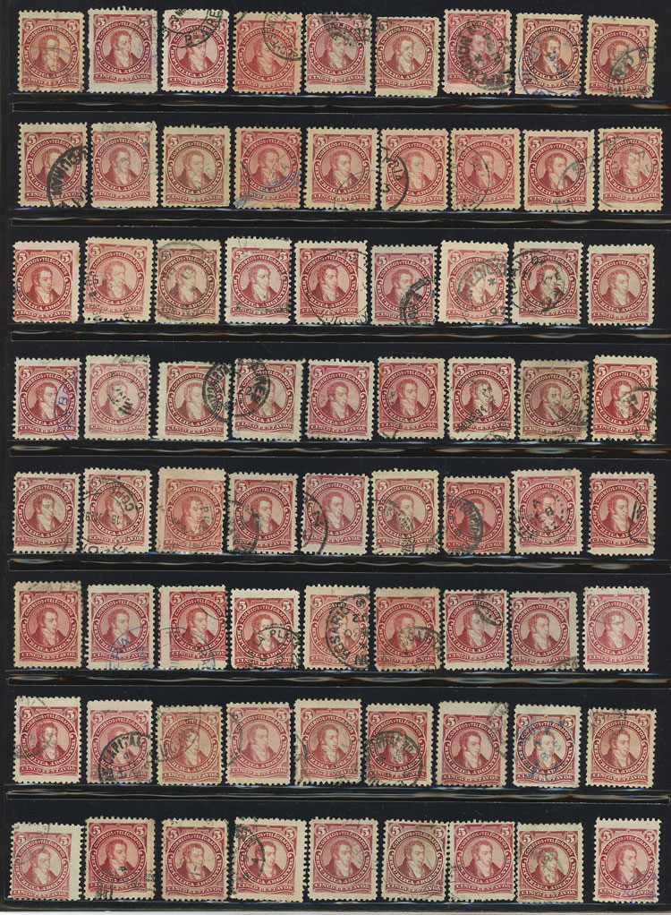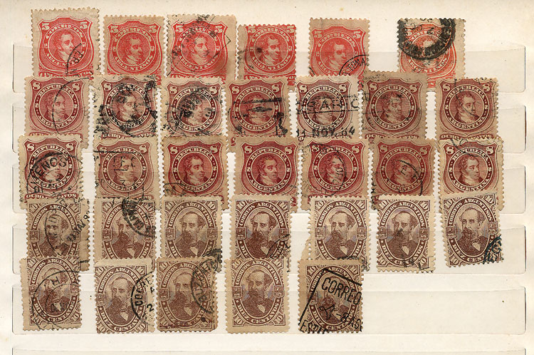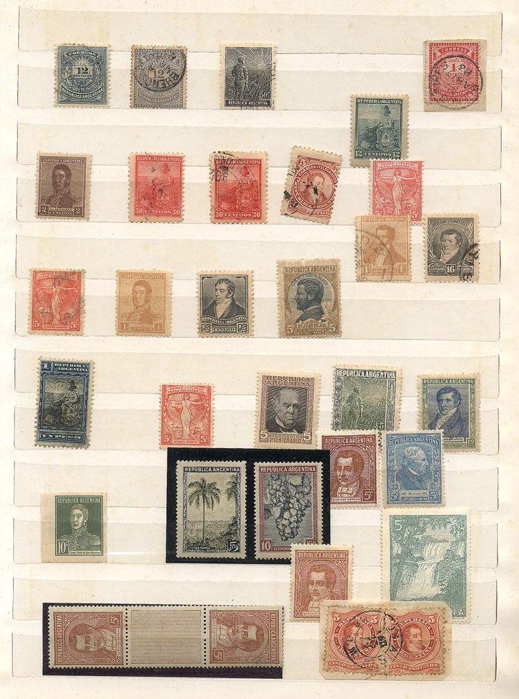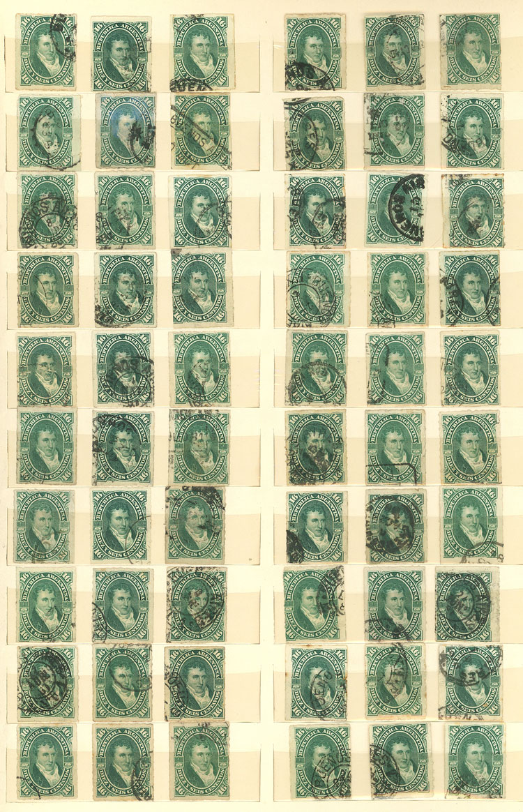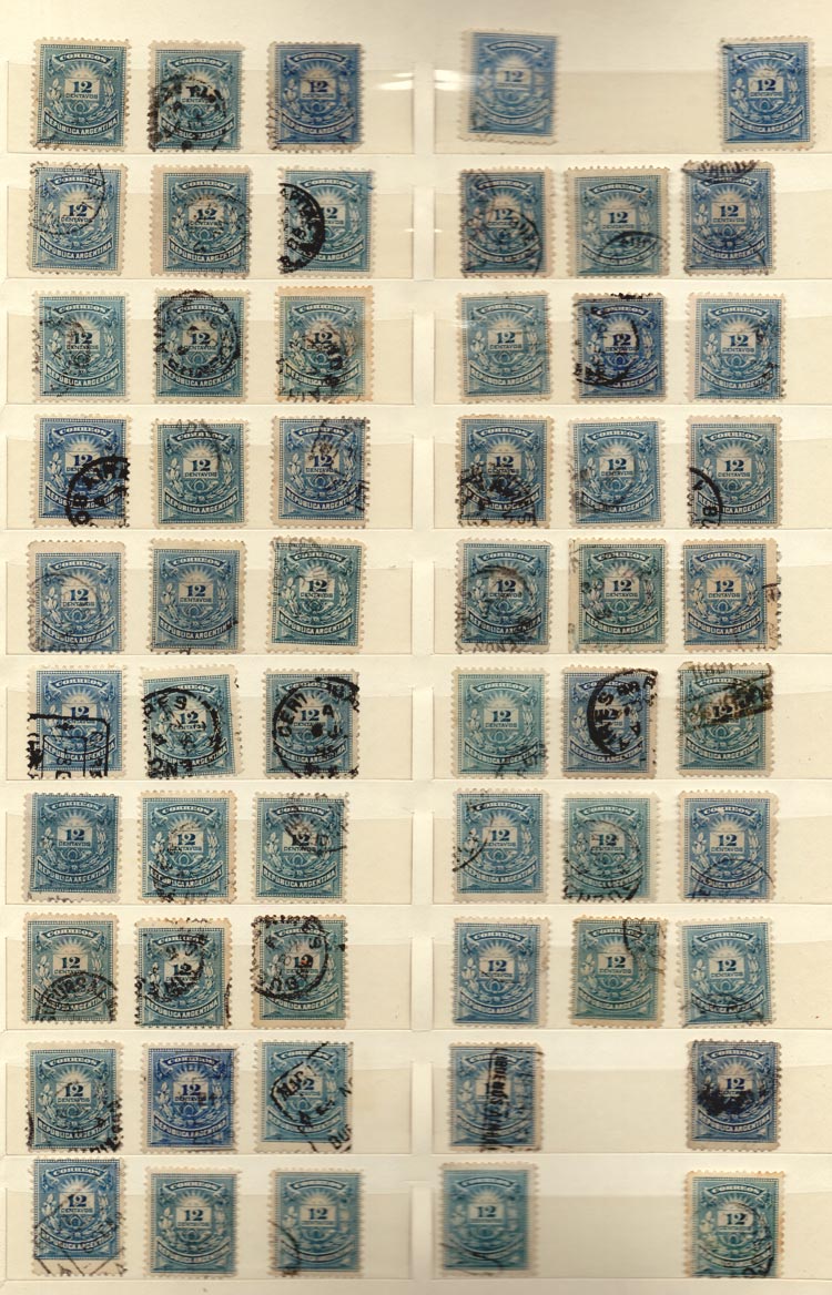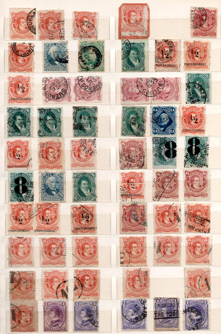 SEVERAL THOUSANDS stamps of the Rivadavia Belgrano & San Martin issue, used and COMPLETELY UNCHECKED. The expert will surely find watermark and perforation varieties, also good cancels, very attractive! (Image) (Image-02)