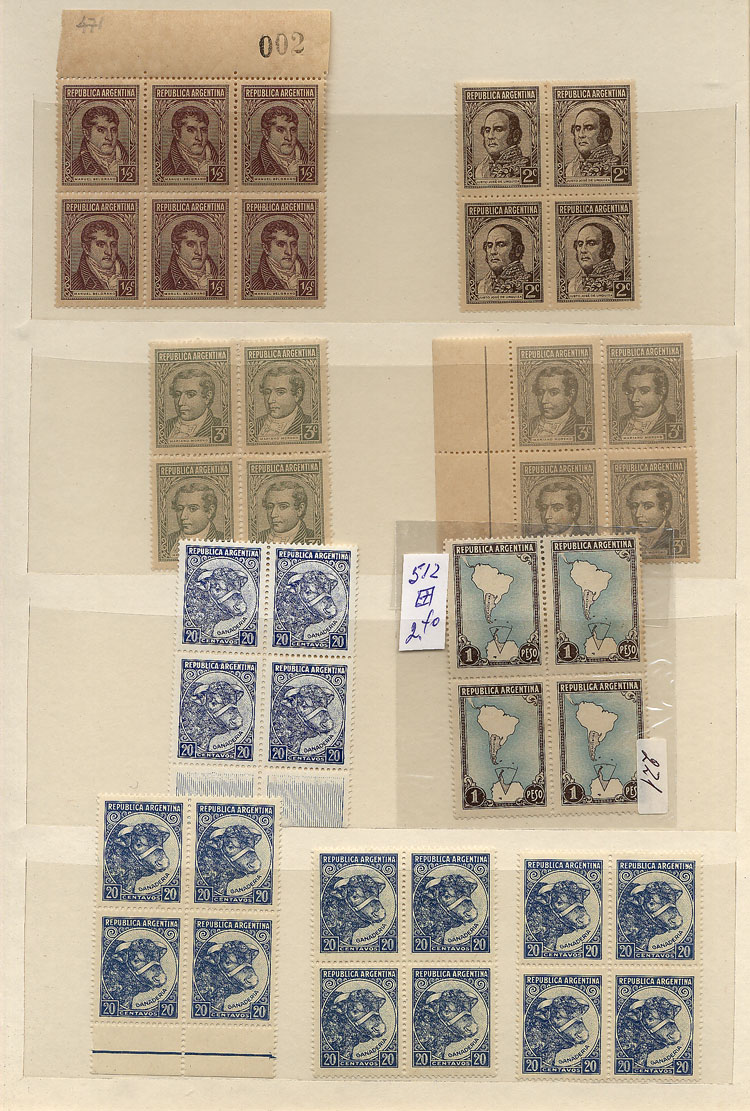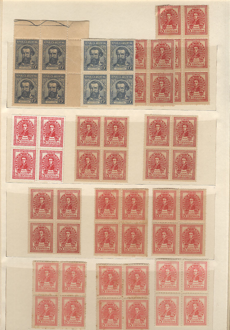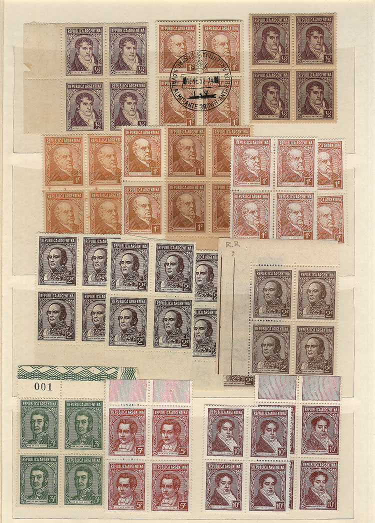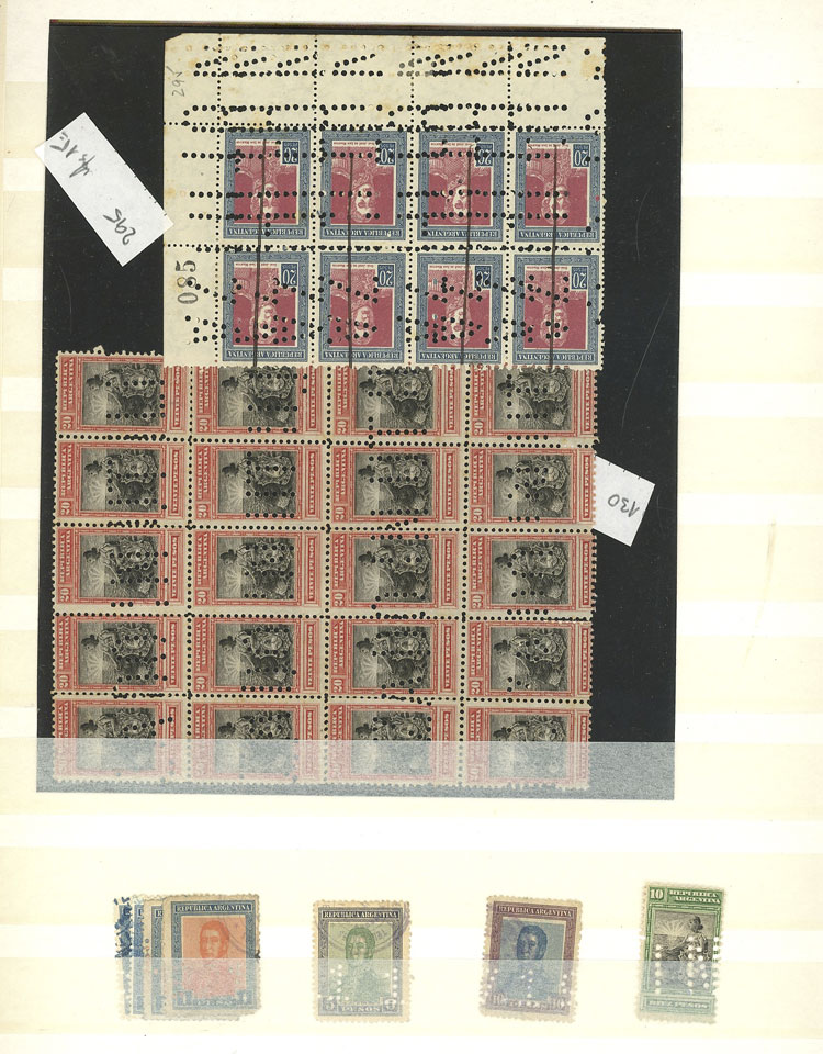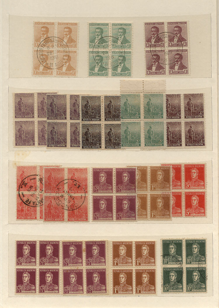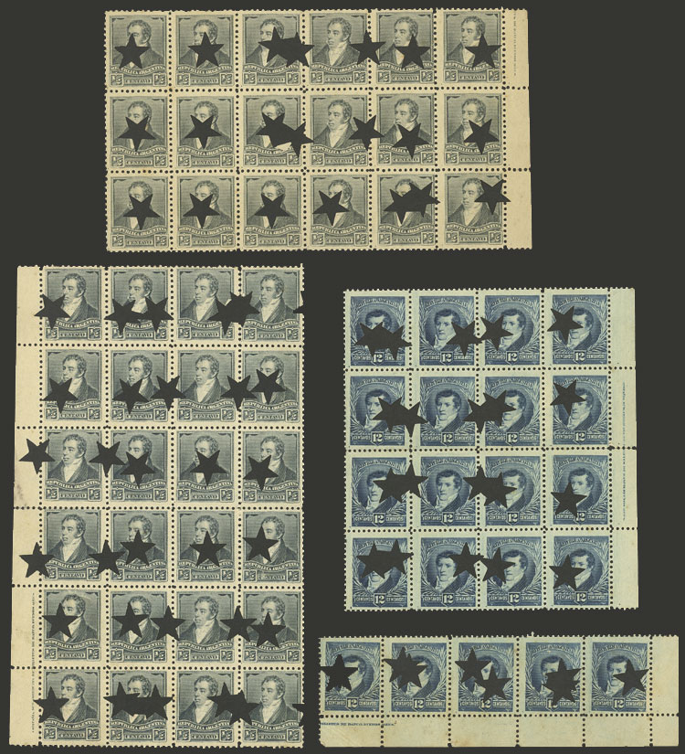 PUNCH CANCEL: Blocks of ½c. and 12½ of the "3 Próceres" issue, all with "star" bulk mail cancel , some with DOUBLE CANCELLATION, VF quality, rare group: NOTE: The previous owner paid US$346.50 for this lot! (Image)