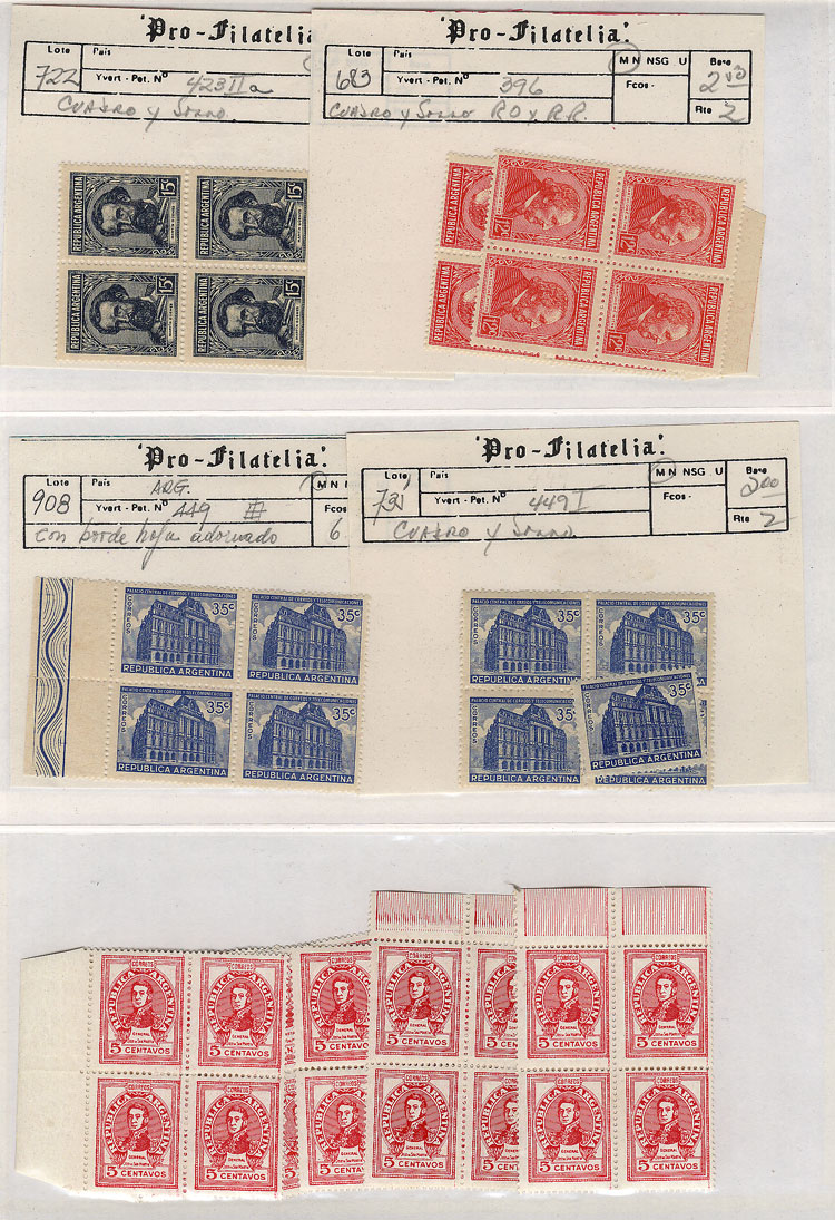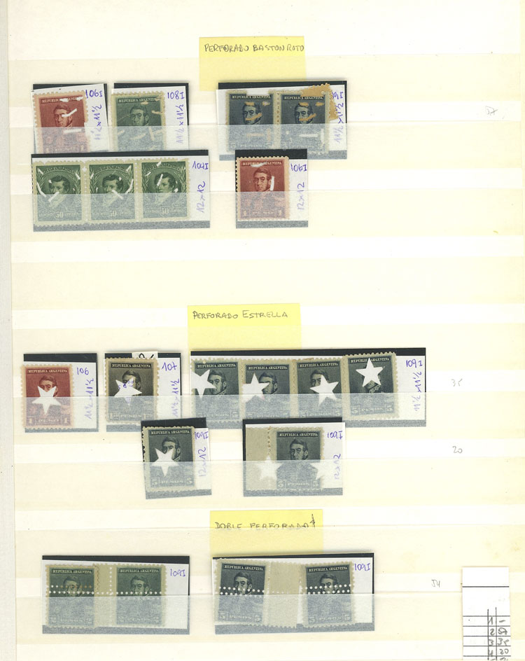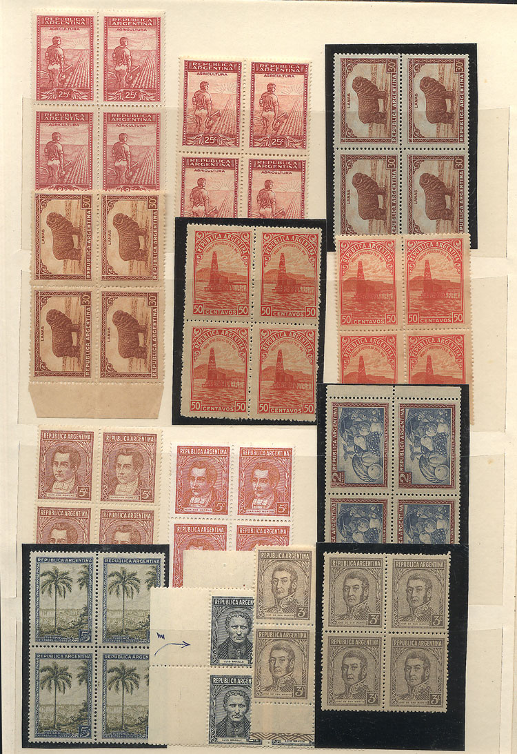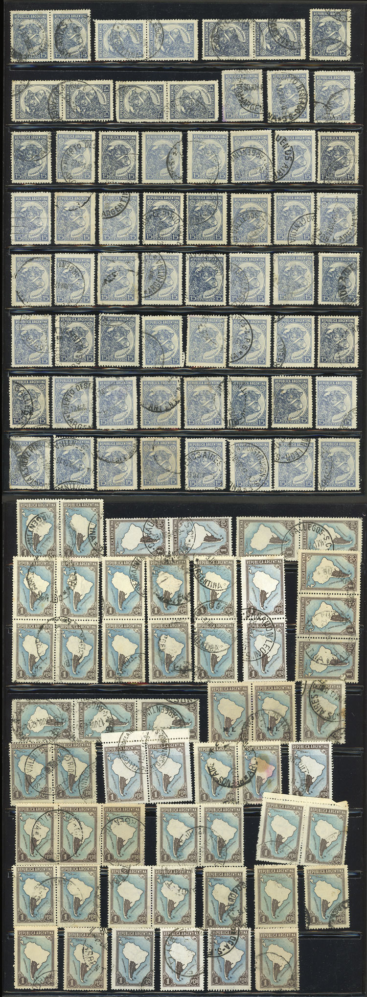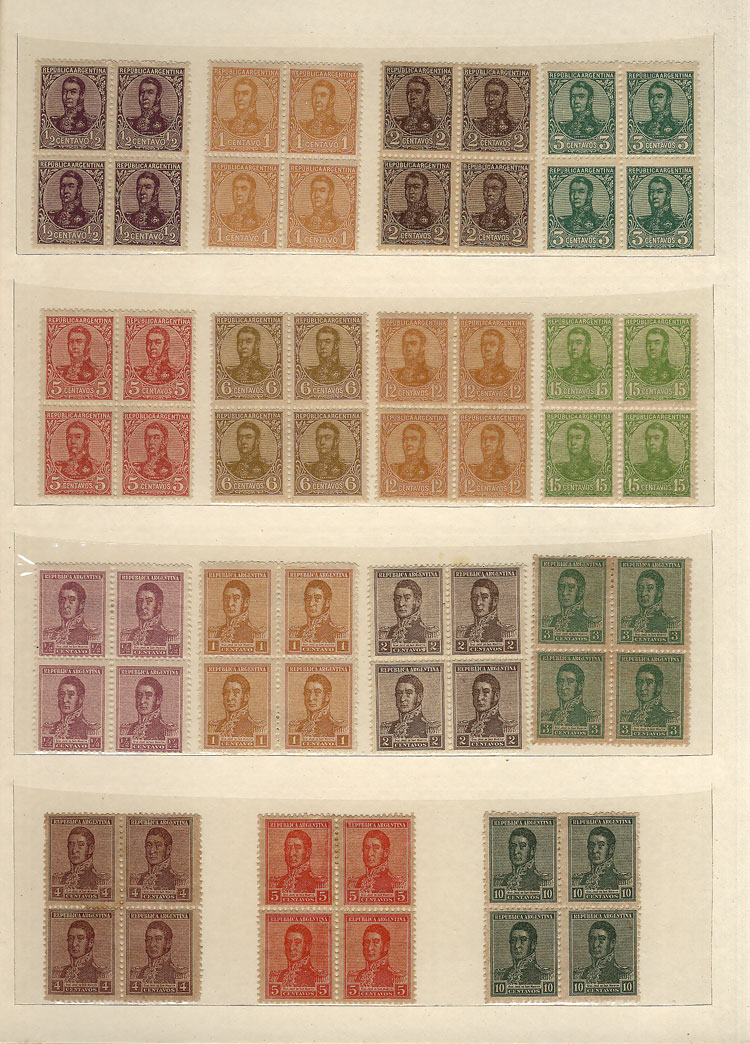 PUNCH CANCEL: Blocks of ½c. and 12½ of the "3 Próceres" issue, all with "star" bulk mail cancel , some with DOUBLE CANCELLATION, VF quality, rare group: NOTE: The previous owner paid US$346.50 for this lot! (Image)