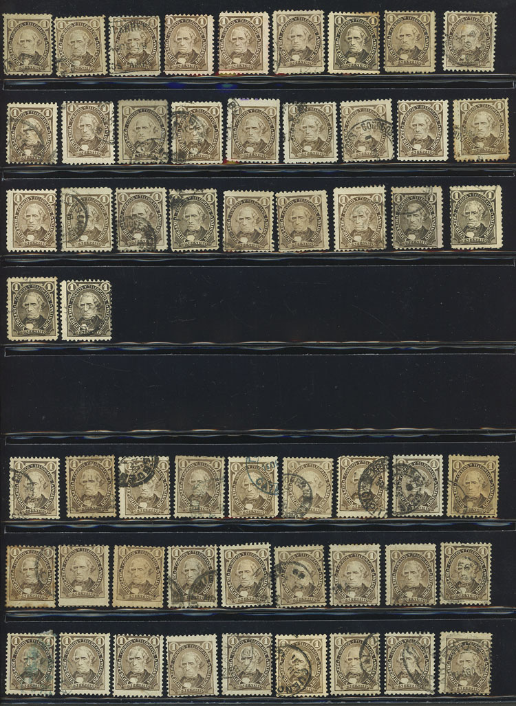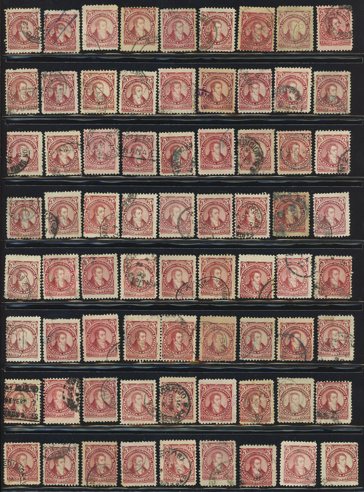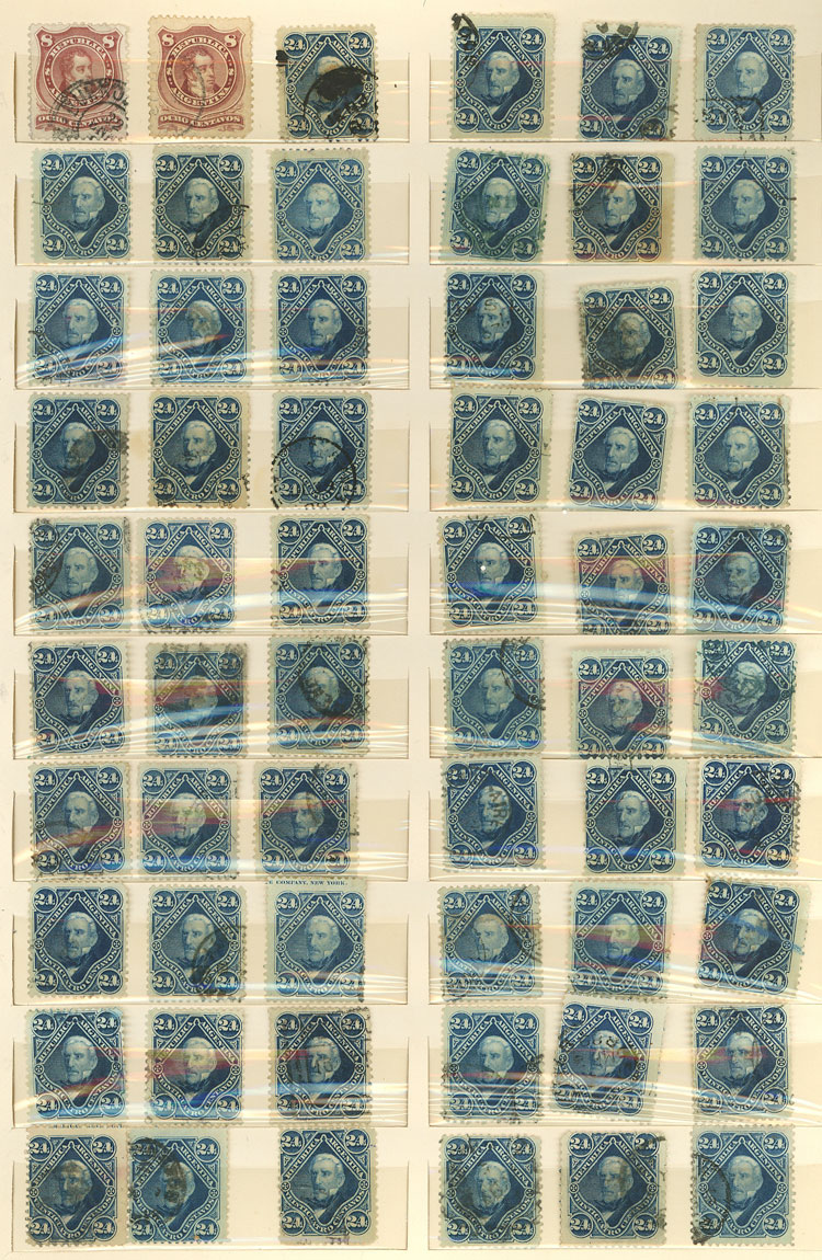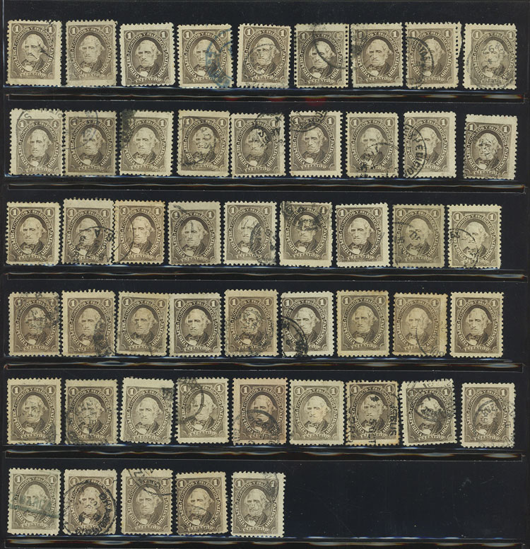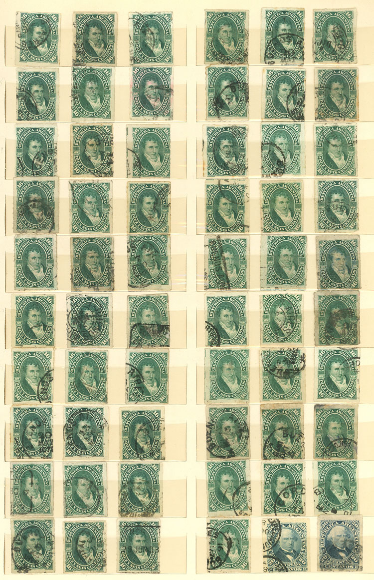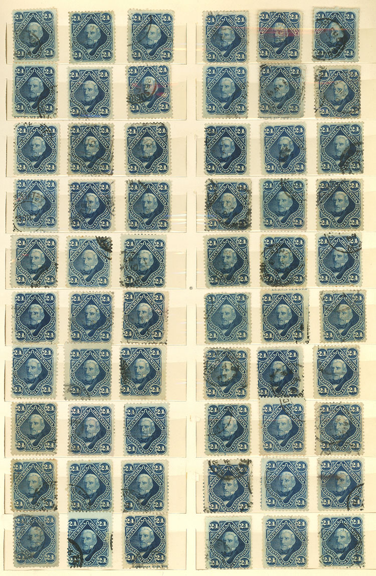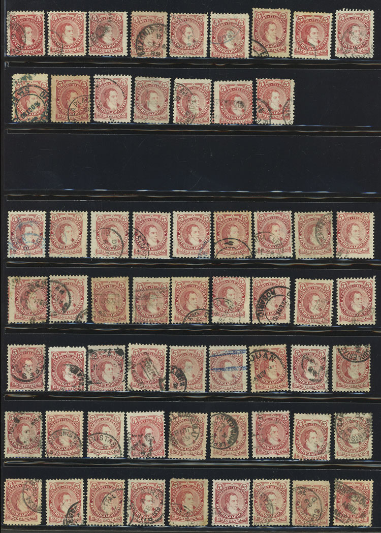 PO CANCELS: Over 120 stamps of the Seated Liberty issue, all with cancels of traveling PO, almost all different (there are different railways and PO numbers!), very fine general quality, low start! (Image)