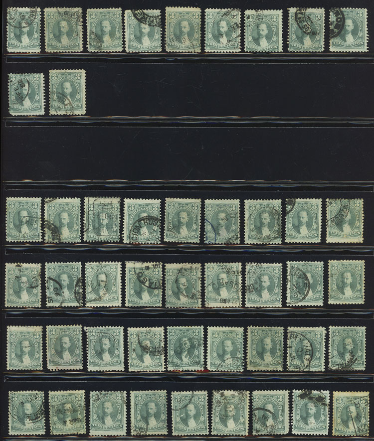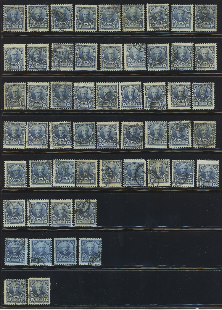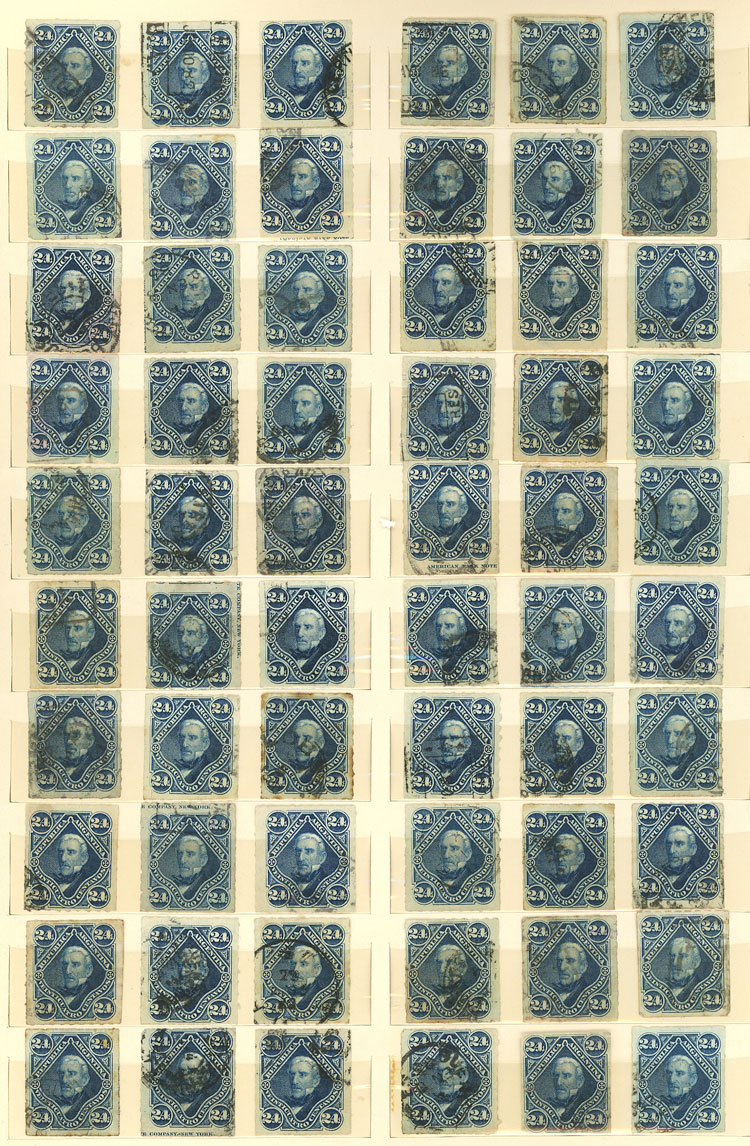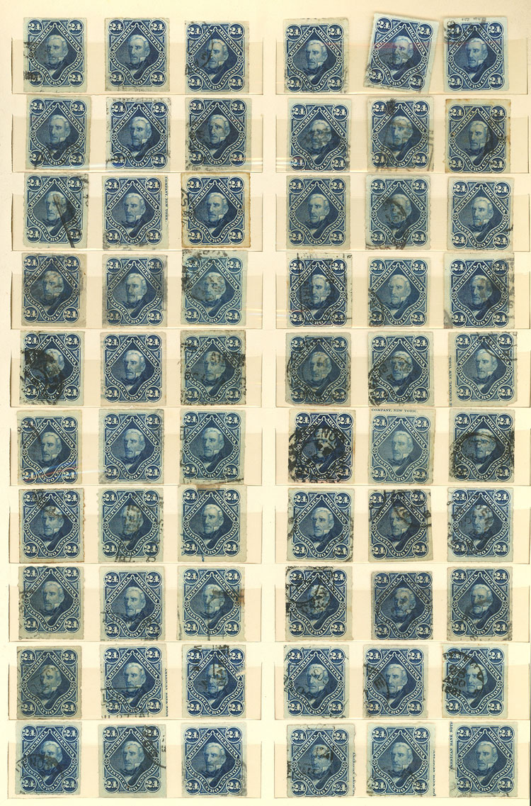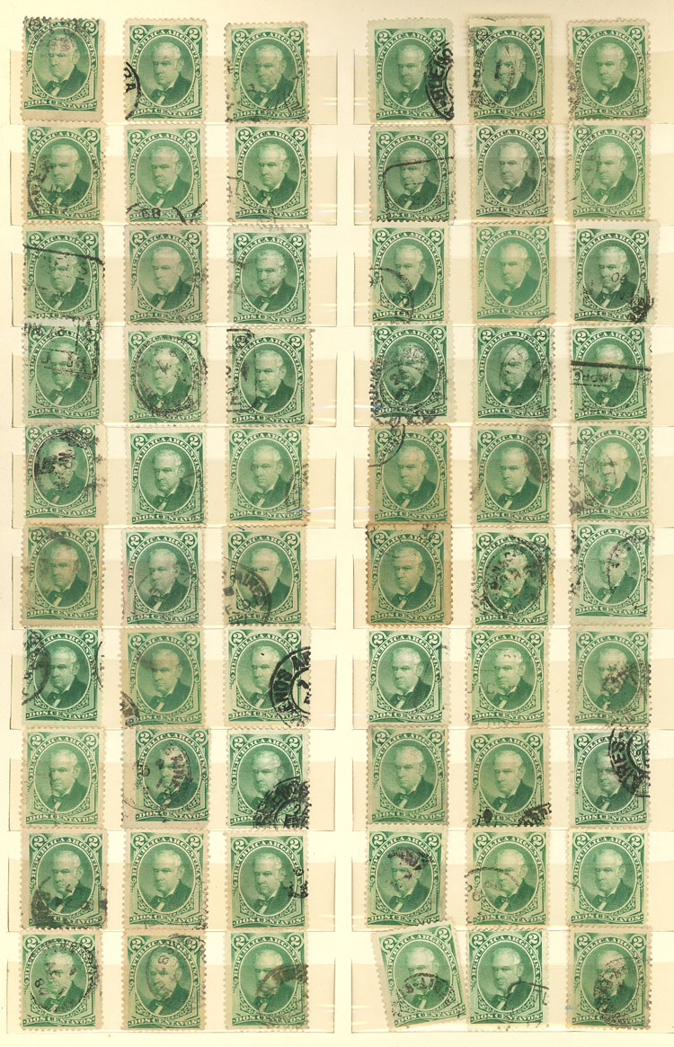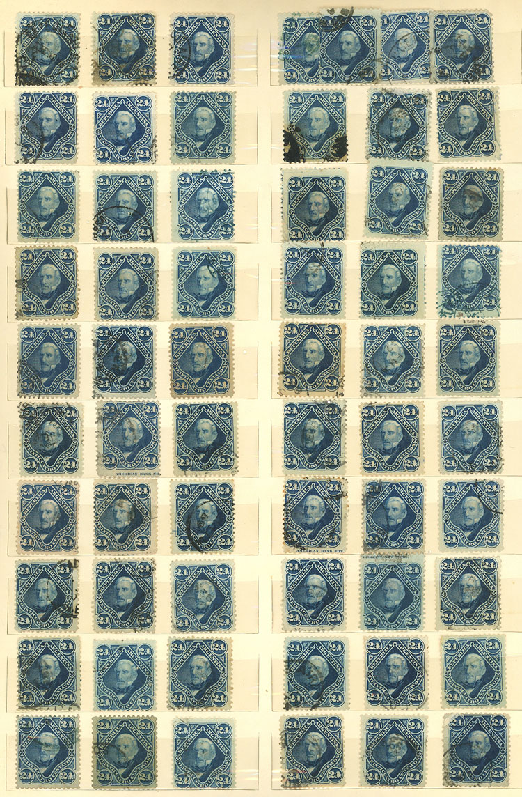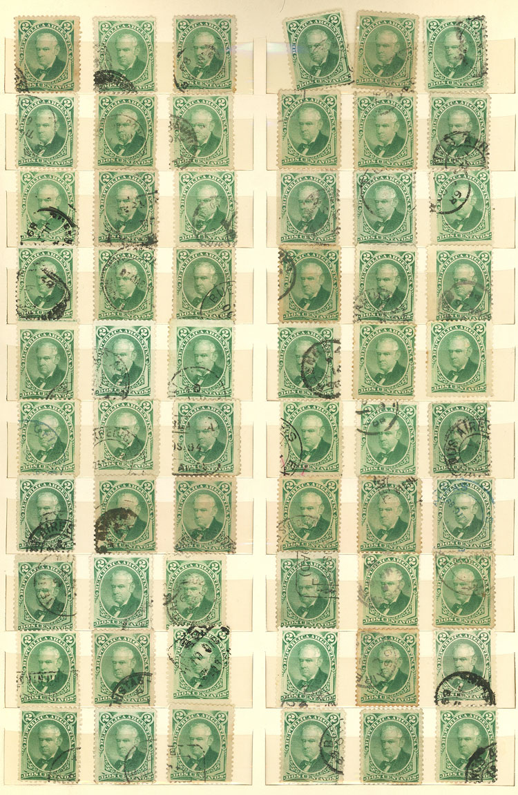 PO CANCELS: Over 120 stamps of the Seated Liberty issue, all with cancels of traveling PO, almost all different (there are different railways and PO numbers!), very fine general quality, low start! (Image)