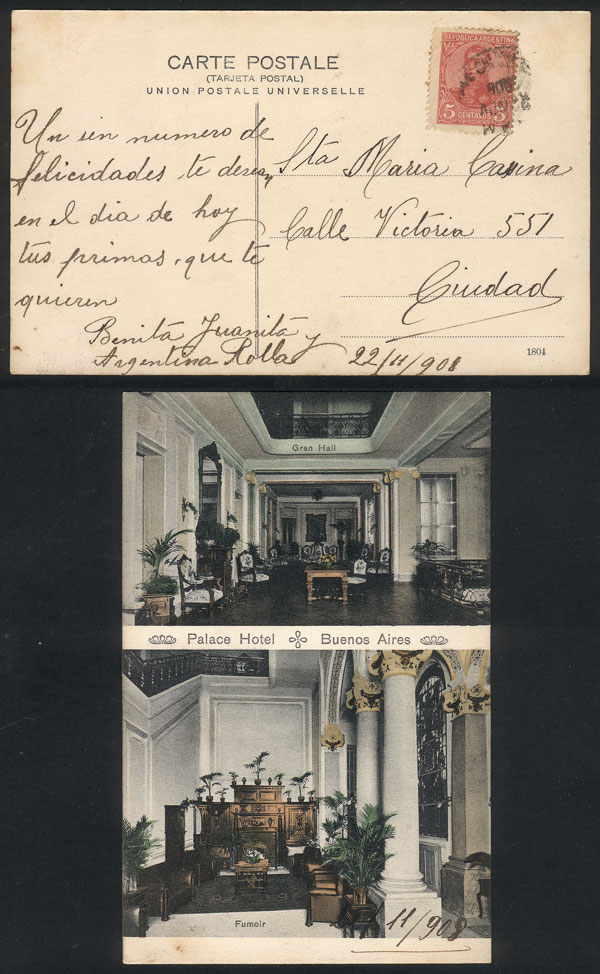 Aires: Palace Hotel, rare postcard used on 22/NO/1908, excellent quality! (Image)