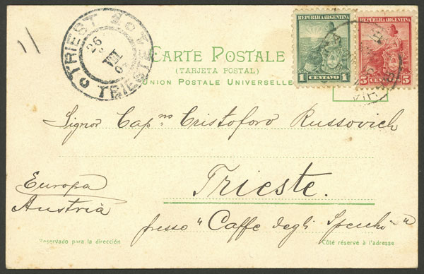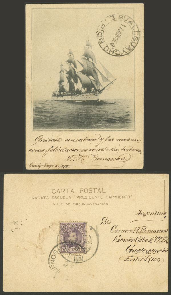 SARMIENTO: Beautiful PC sent from Spain to Gualeguaychu on 28/MAY/1902, excellent quality! (Image)