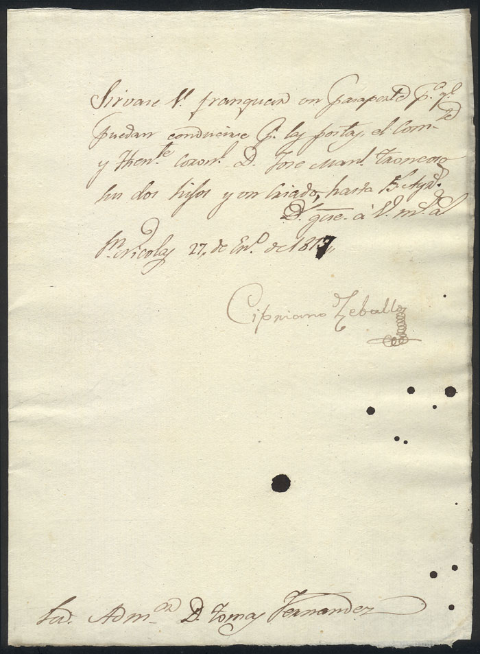 27/JA/1817, passport for Lieutenant colonel José Manuel Troncoso, his 2 sons and a servant, to travel by the postal relay system from San Nicolás to Buenos Aires, signed by Cipriano Zeballos (military commander of San Nicolás), excellent