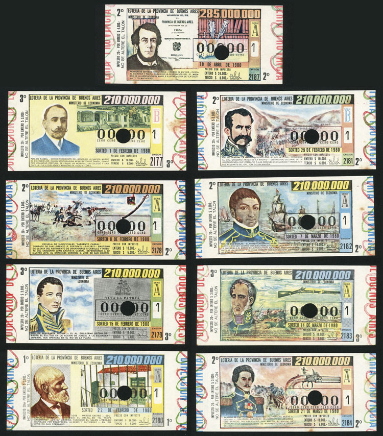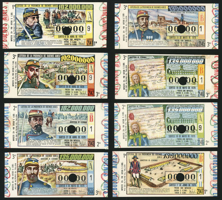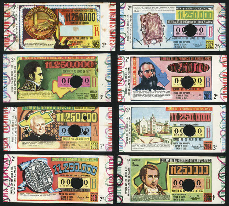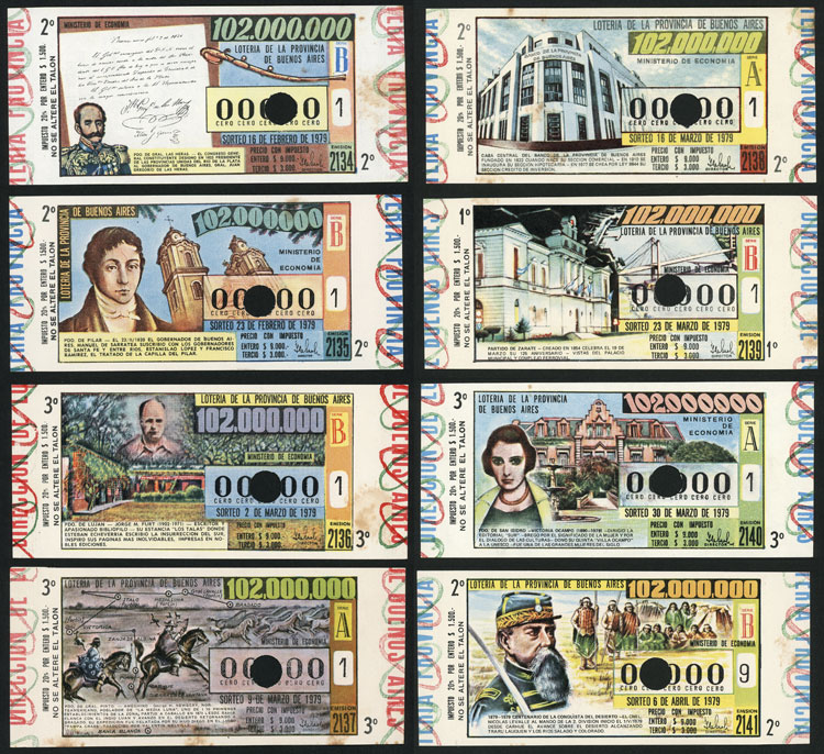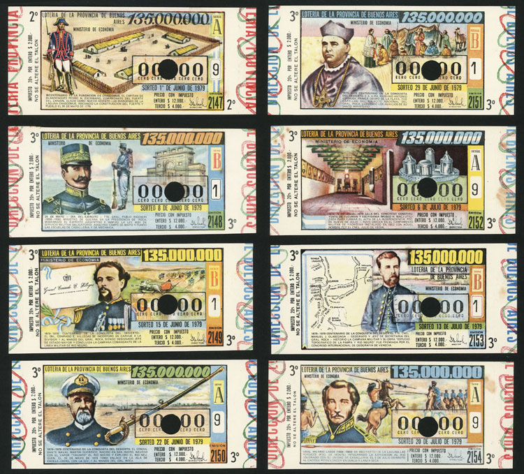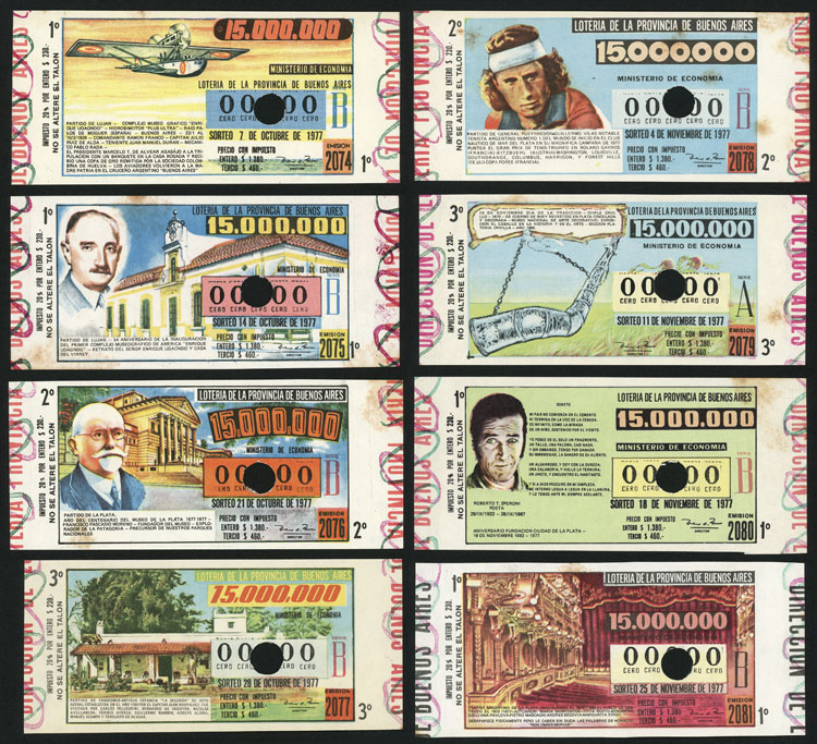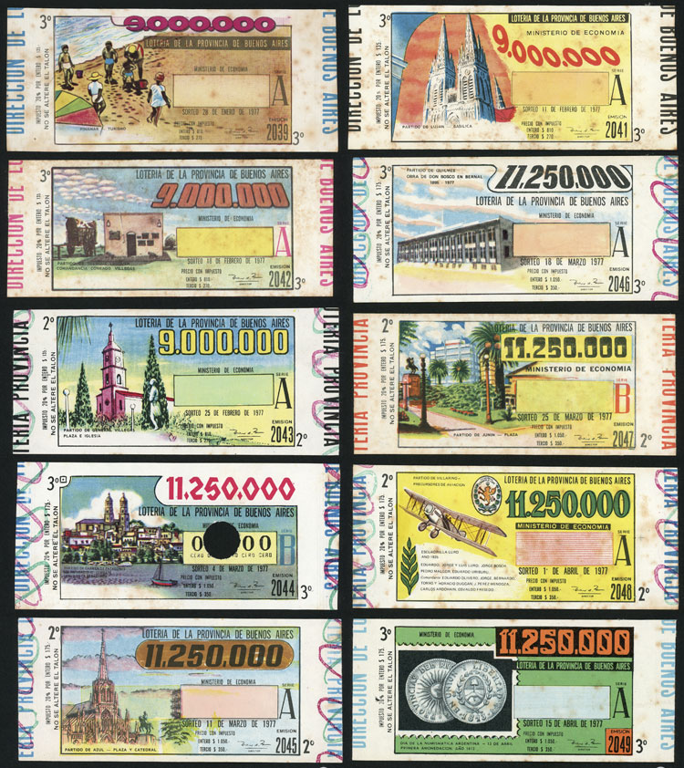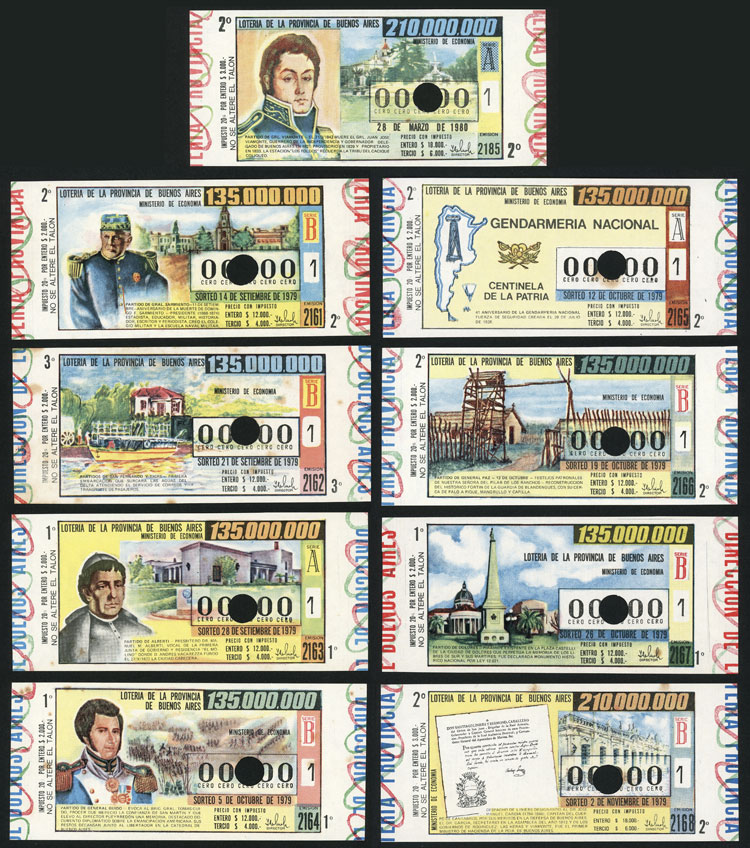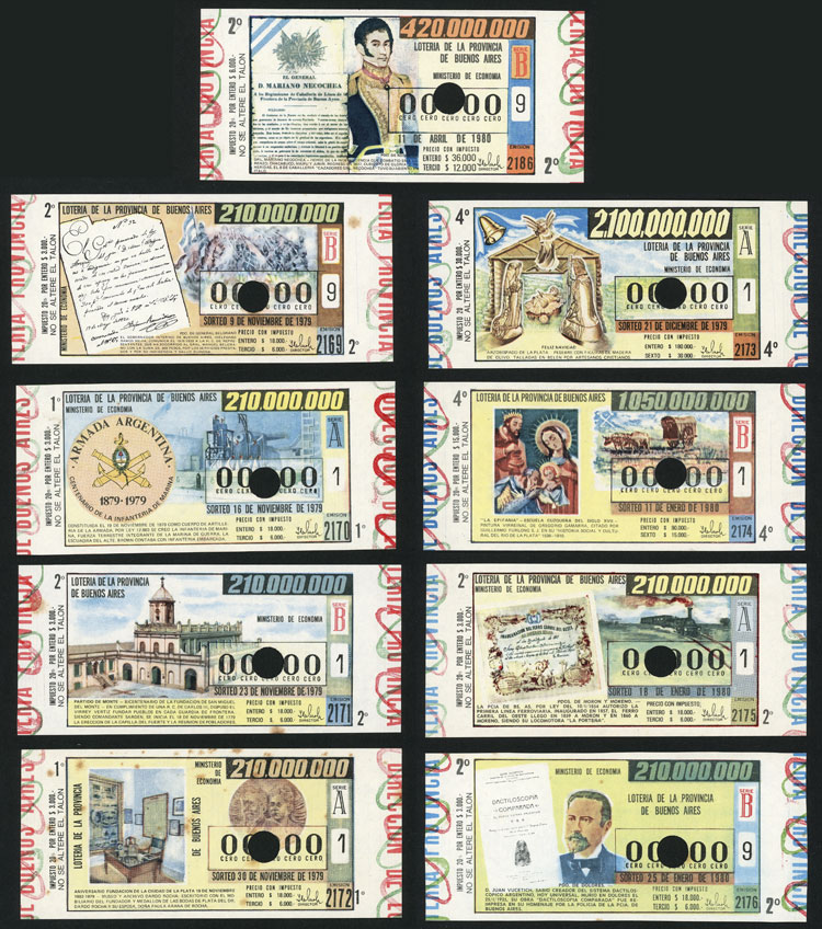 SPECIMENS OF LOTTERY TICKETS of the Province of Buenos Aires (yearS 1976 to 1980), all numbered "00000" and with punch hole or without numbering, OVER 150 DIFFERENT!!, very thematic and interesting, rare group (Image) (Image-02)