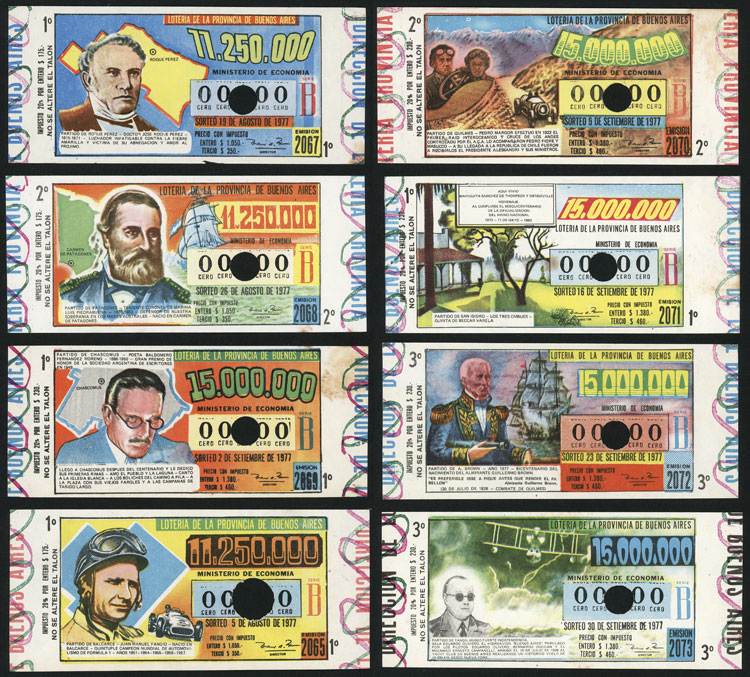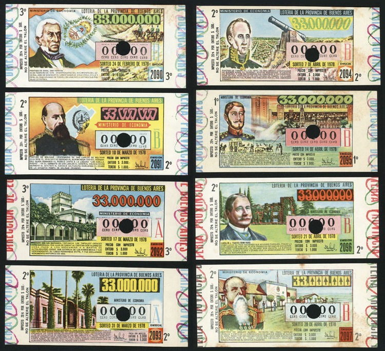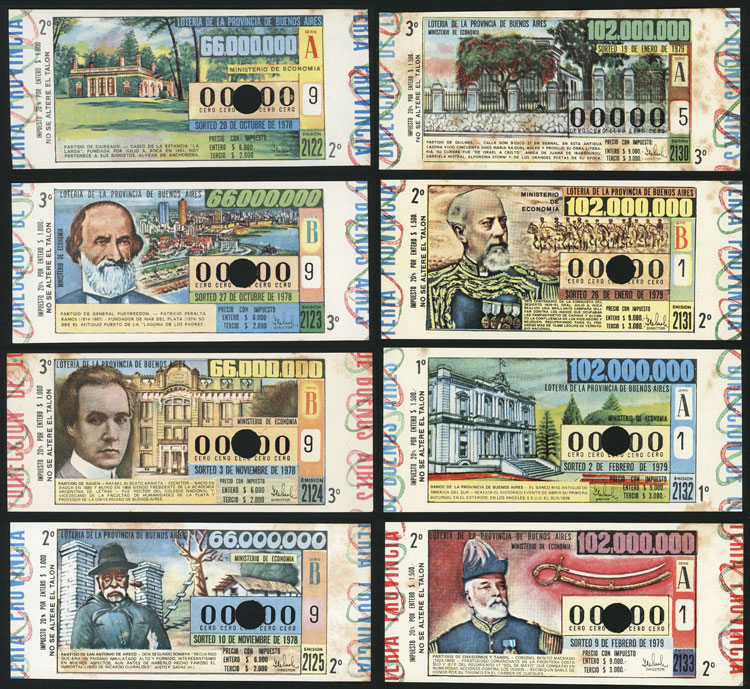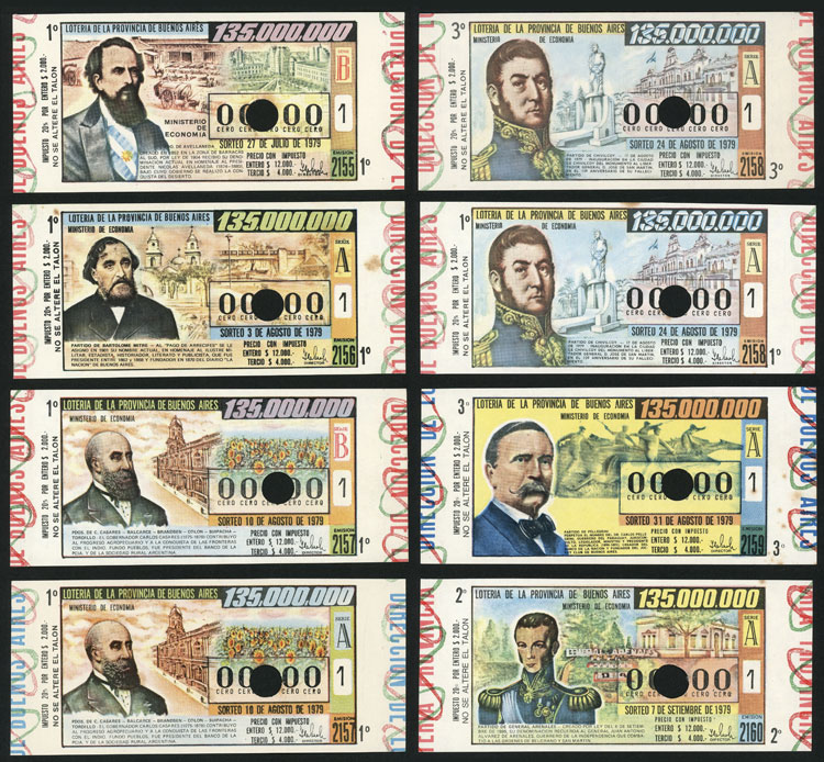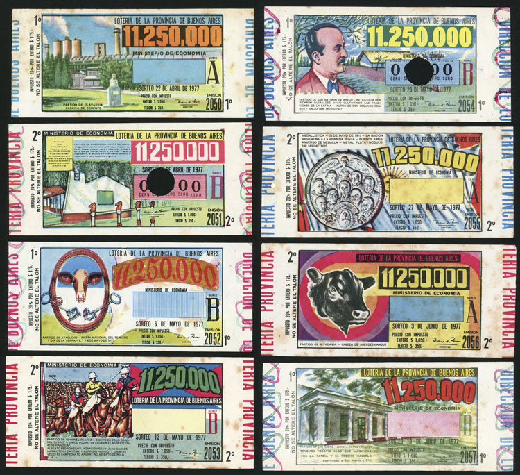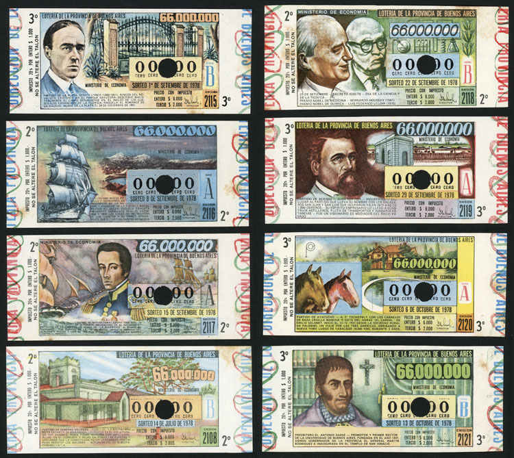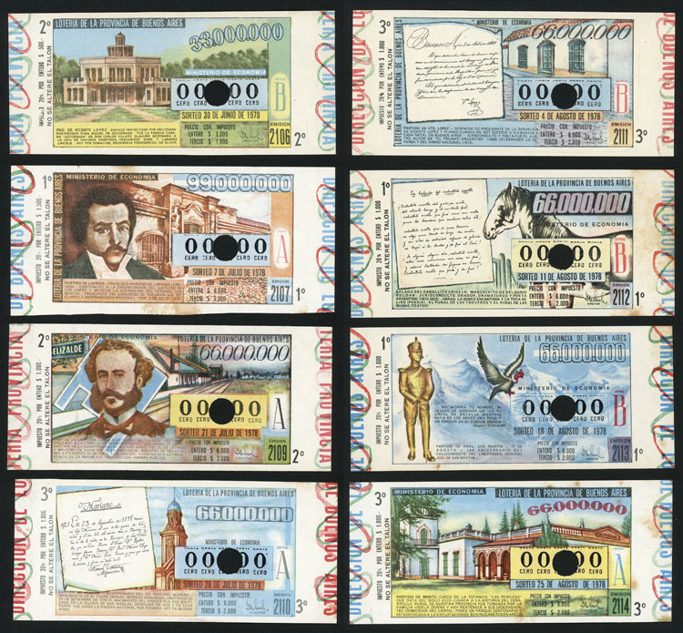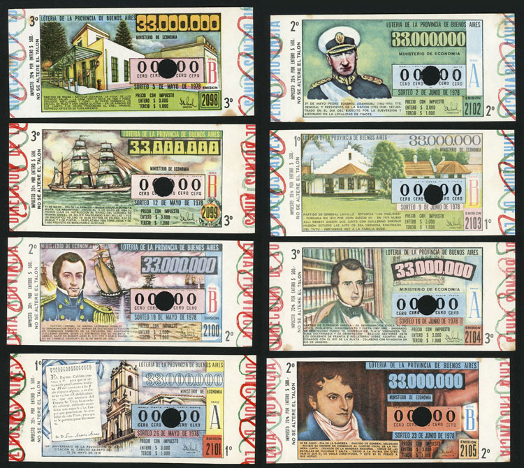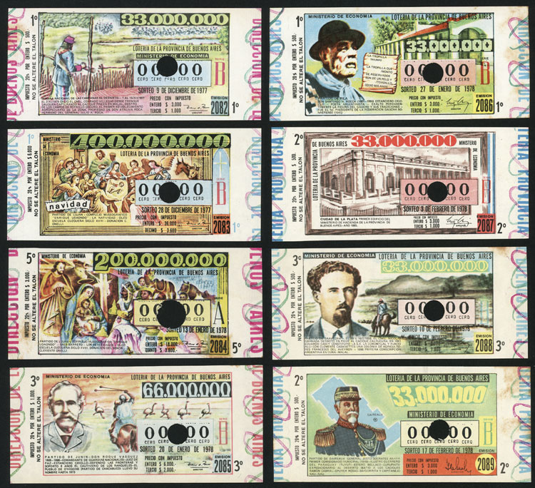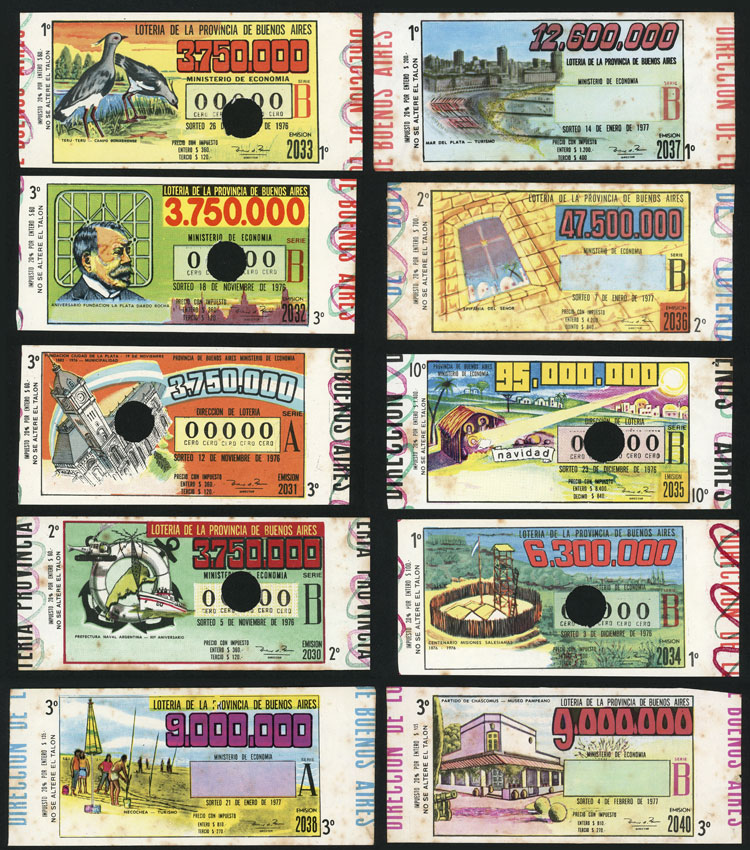SPECIMENS OF LOTTERY TICKETS of the Province of Buenos Aires (yearS 1976 to 1980), all numbered "00000" and with punch hole or without numbering, OVER 150 DIFFERENT!!, very thematic and interesting, rare group (Image) (Image-02)