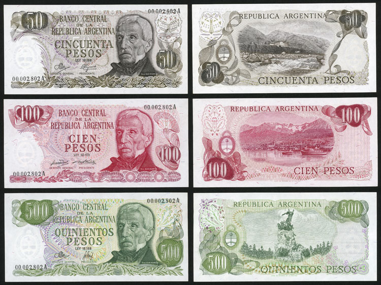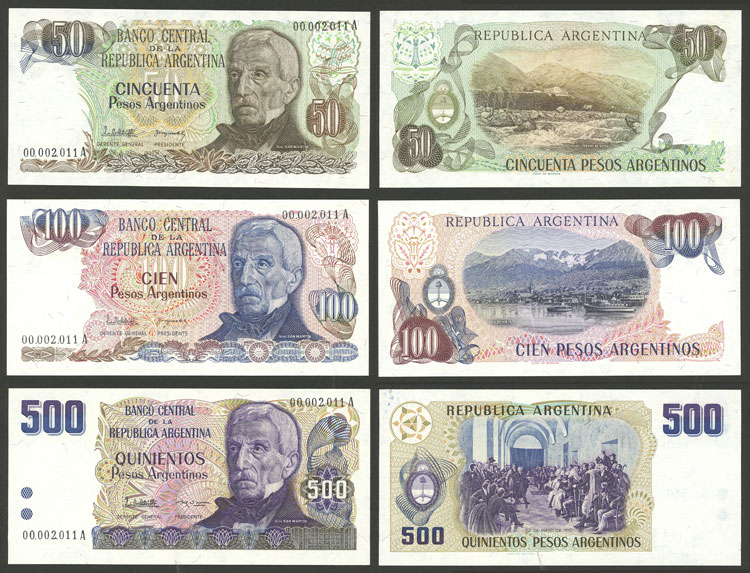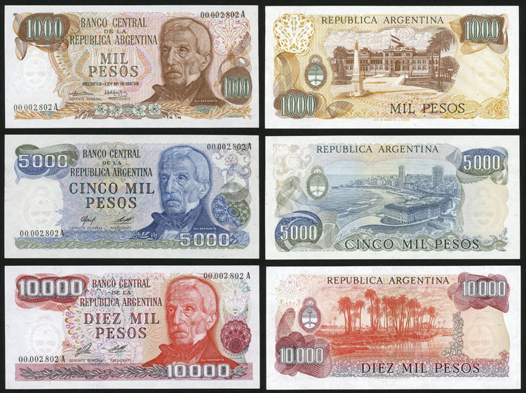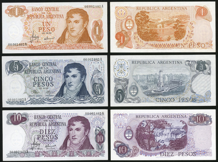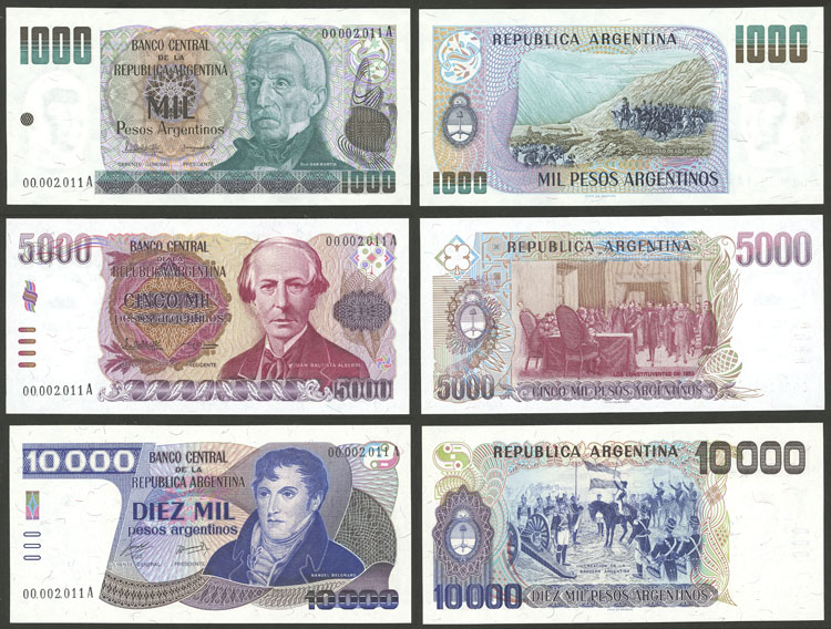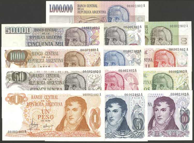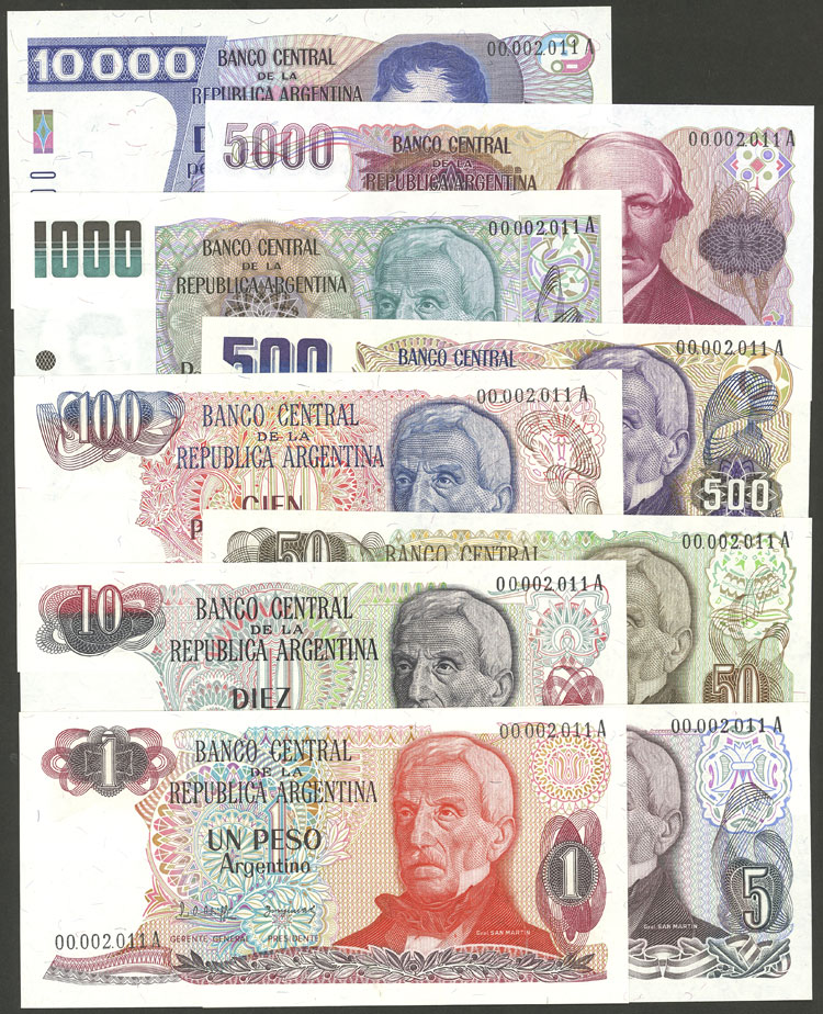 Unsued banknotes with face values of between 1 and 10,000 Pesos Argentinos, all with low numbering "00.002.011A", excellent quality, rare group! (Image) (Image-02)