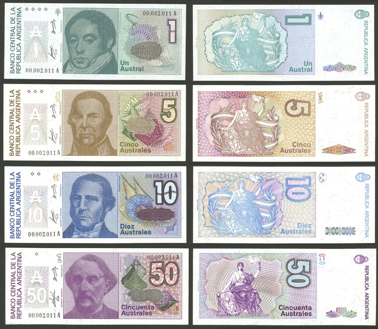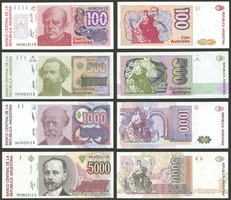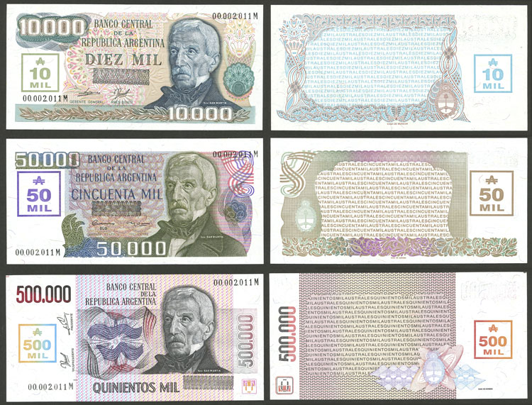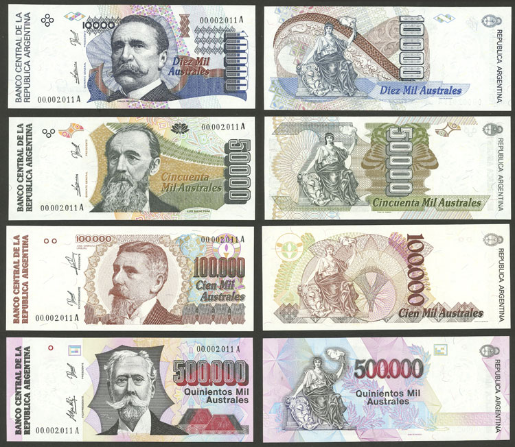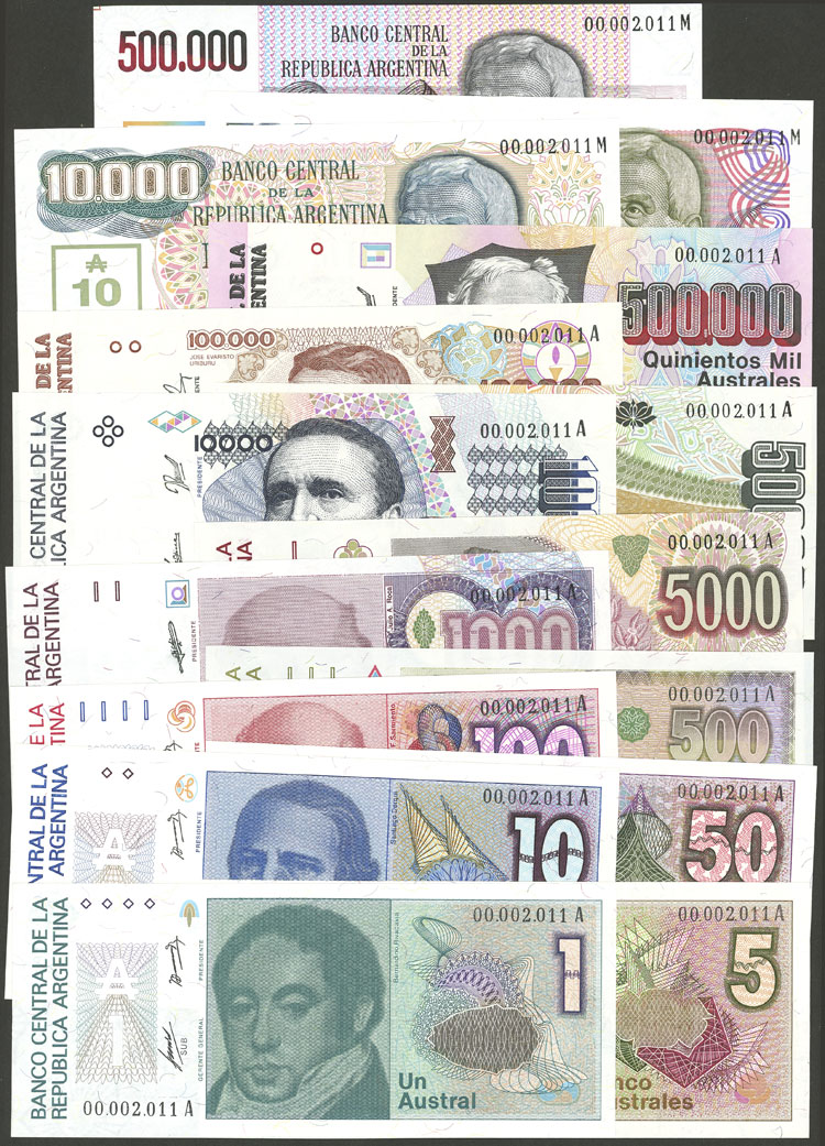 Unsued banknotes with face values of between 1 and 500,000 Australes, all with low numbering "00.002.011A", excellent quality, rare group! (Image) (Image-02)