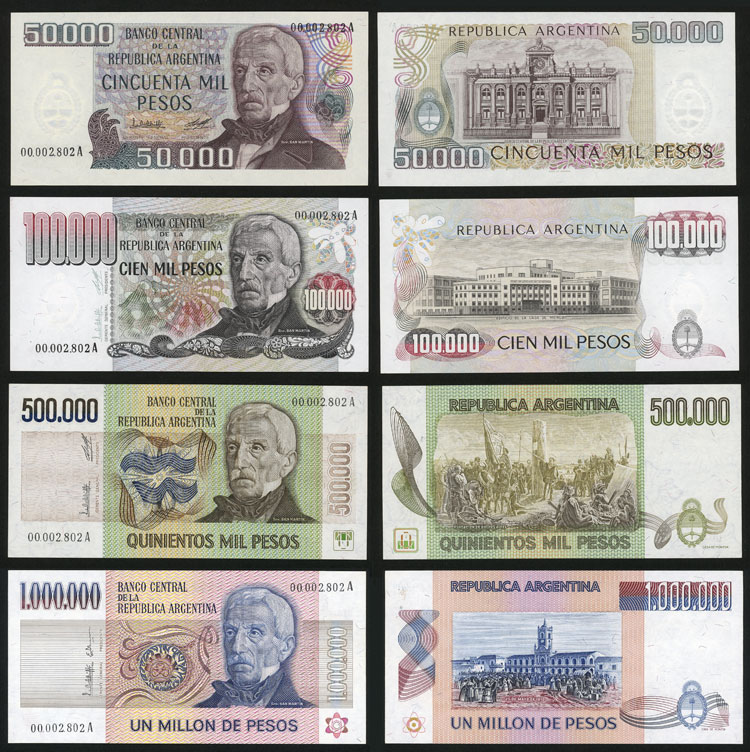 Unsued banknotes with face values of between 1 and 1,000,000 Pesos (ley 18188), all with low numbering "00.002.011A", excellent quality, rare group! (Image) (Image-02)