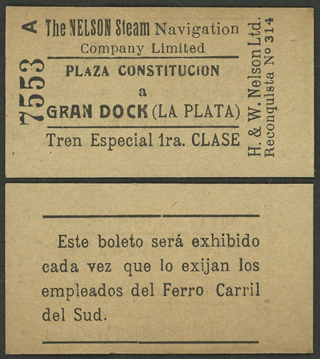 1920, rare train ticket of Ferrocarril de Sud, Plaza Constitución (Buenos Aires) to Gran Dock (port of La Plata), 1st class, for passengers of a ship of "The Nelson Steam Navigation Co Ld", excellent quality! (Image)