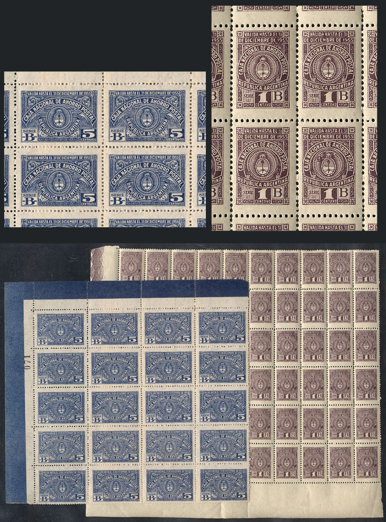 SAVINGS BANK: 2 Large blocks of stamps of the year 1955: 1c. in block of 60 and 5c. in block of 20, MNH, VF quality, rare! (Image)