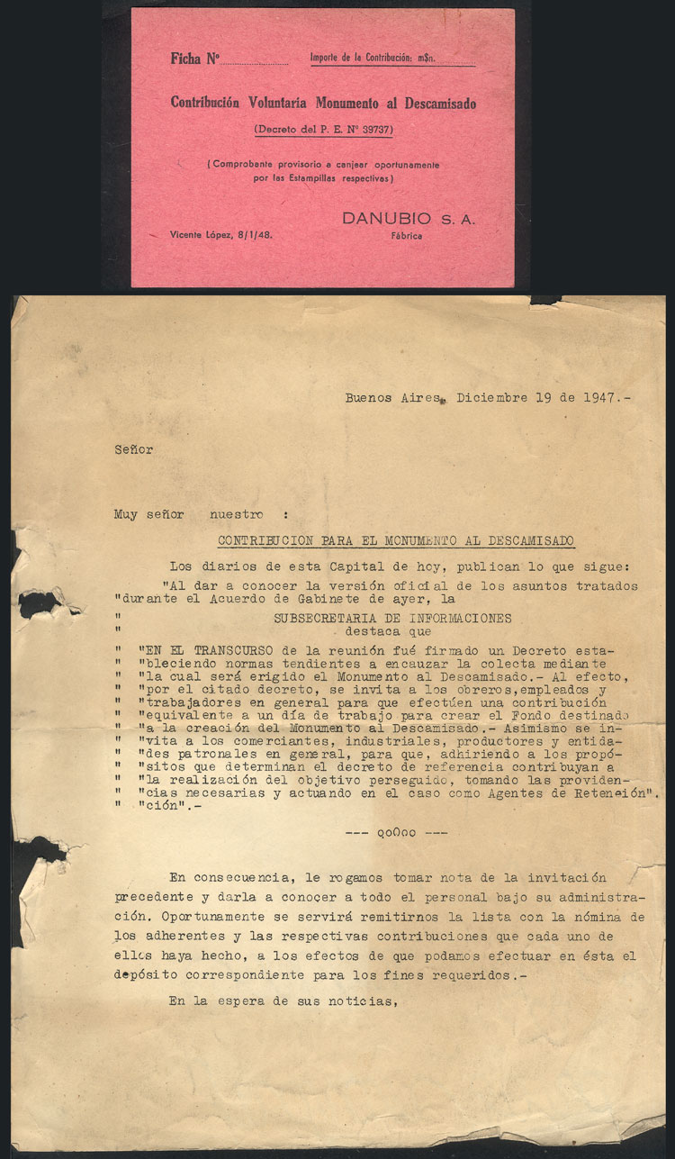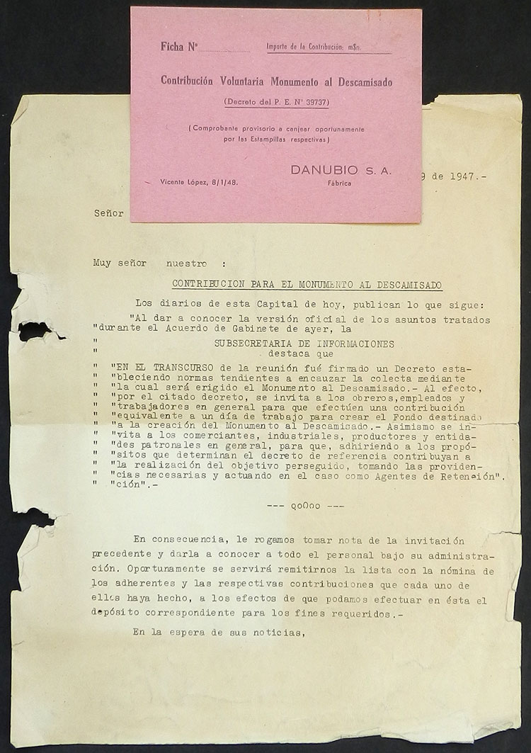 equivalent of a day´s work), and inviting sellers, producers, industrialists and employers in general to contribute and also act as collection agents. The lot also includes a card of "Voluntary Contribution - Monument to the Descamisado" of Danubio
