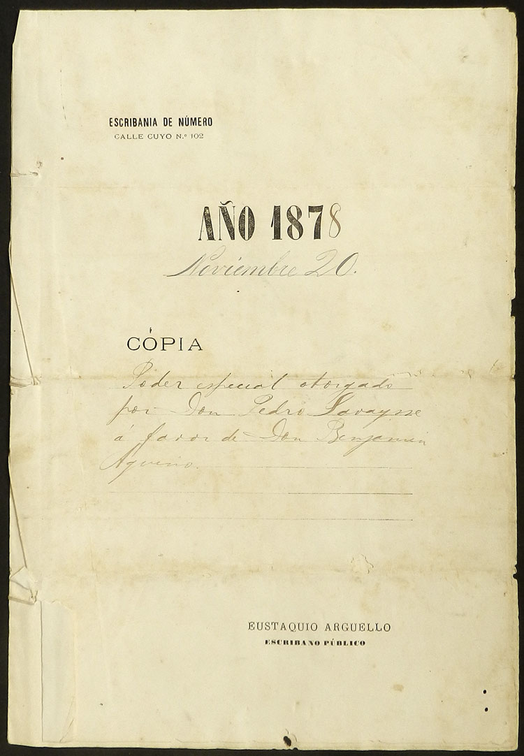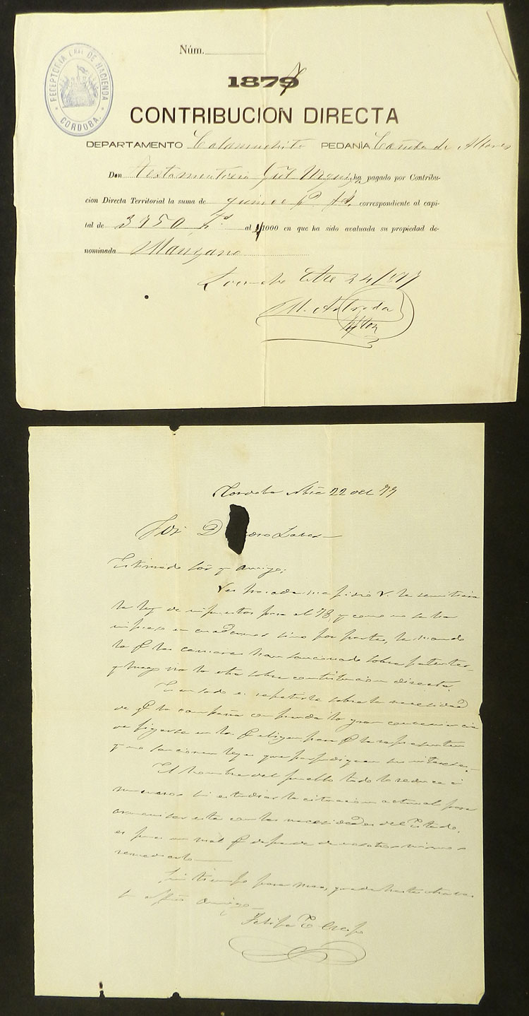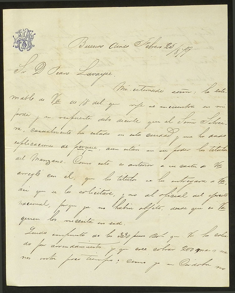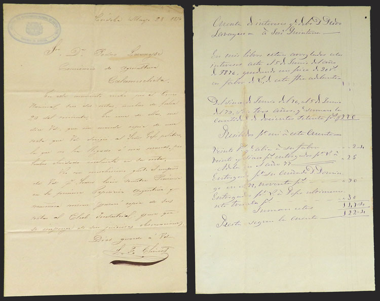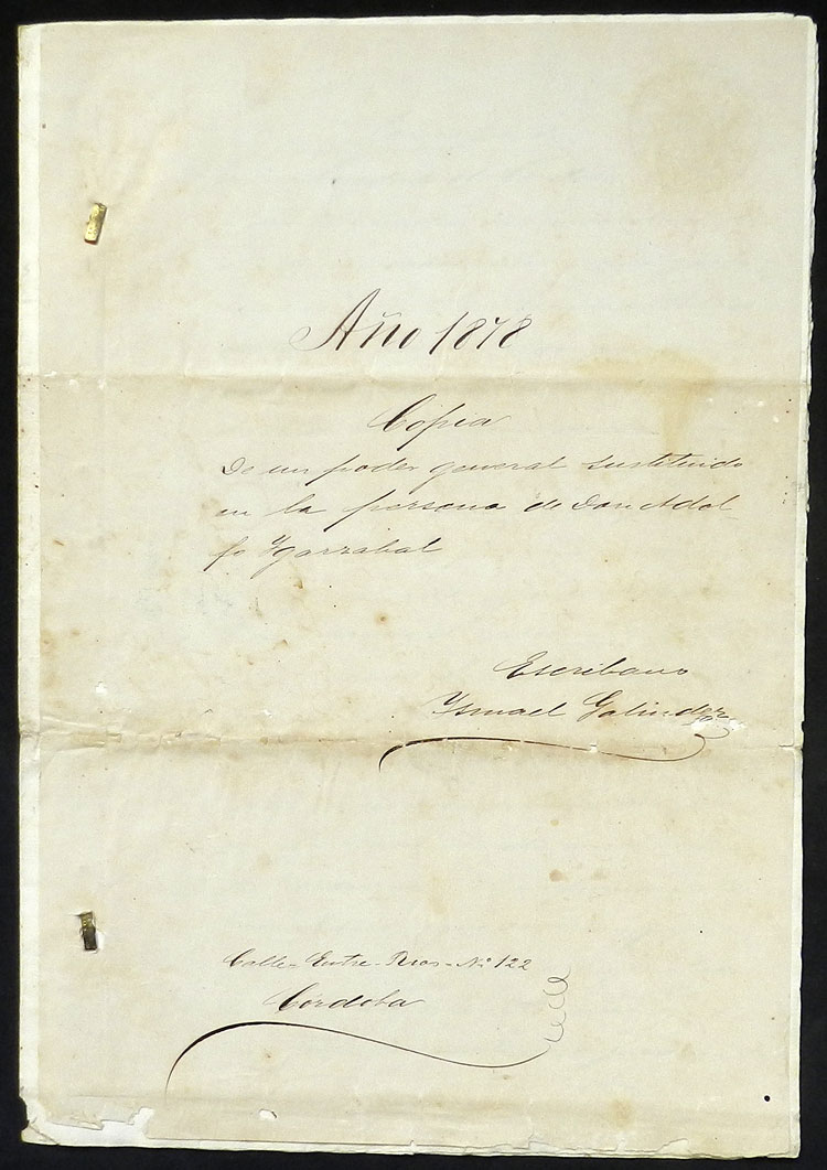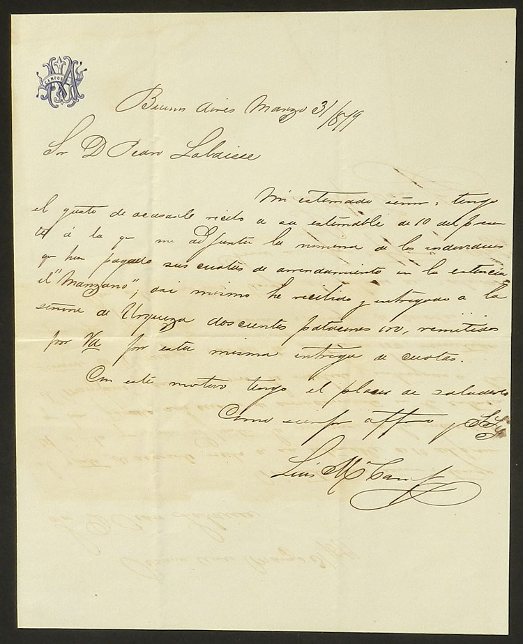 political situation), Angel Carranza, Aubry Verde and Lino Verde, Emiliano Carmona, Luis F. Thiriot, Sandalio Echevarria, Natal Crespo, José de la Quintana, and many more. The letters and documents have varied origins: Córdoba, Buenos Aires, Cañada