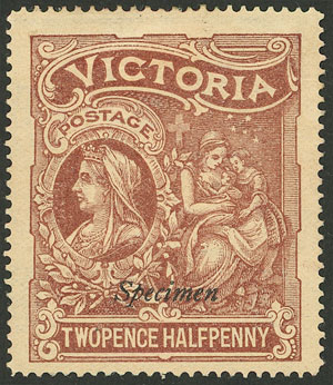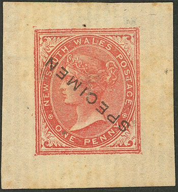 square of old 1p. postal stationery with inverted "SPECIMEN" overprint, very attractive! (Image)
