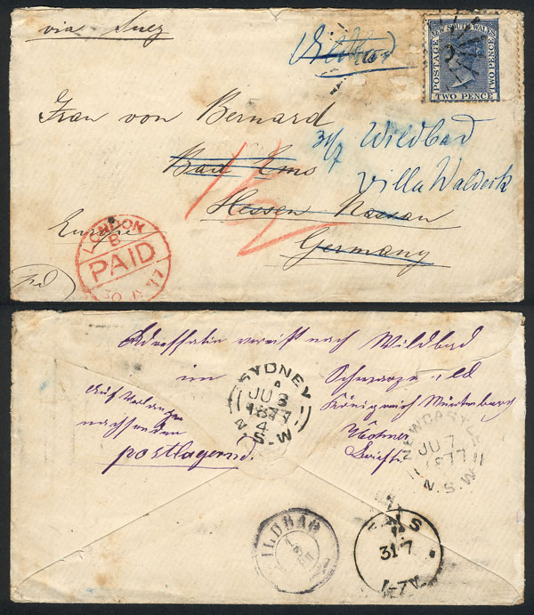from NEWCASTLE to Bad Ems (Germany) on 7/JUN/1877, franked with 2p. with "55" numeral cancel (the original postage had another stamp, lost in transit to Europe). With transit marks of Sydney (8/JUN), London (30/JUL), arriving in EMS on 31/JUL and