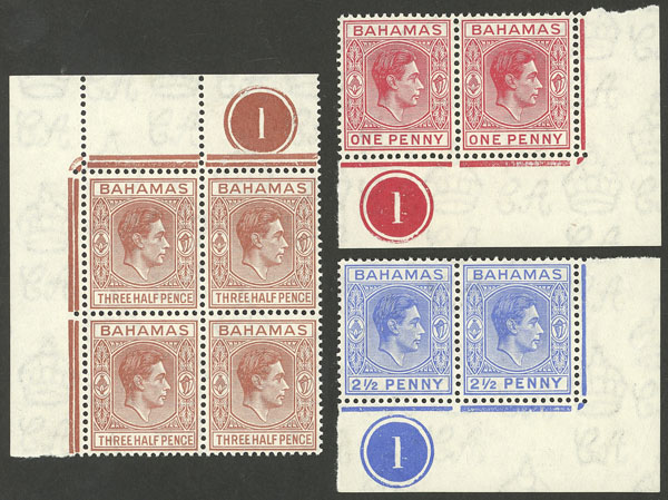 102 + 104, 1938/47 1p. and 2½p. in corner pairs and 1½p. in corner block of 4, all with number "1" in the margin, MNH (the block with light hinge mark in the top margin), excellent quality! (Image)