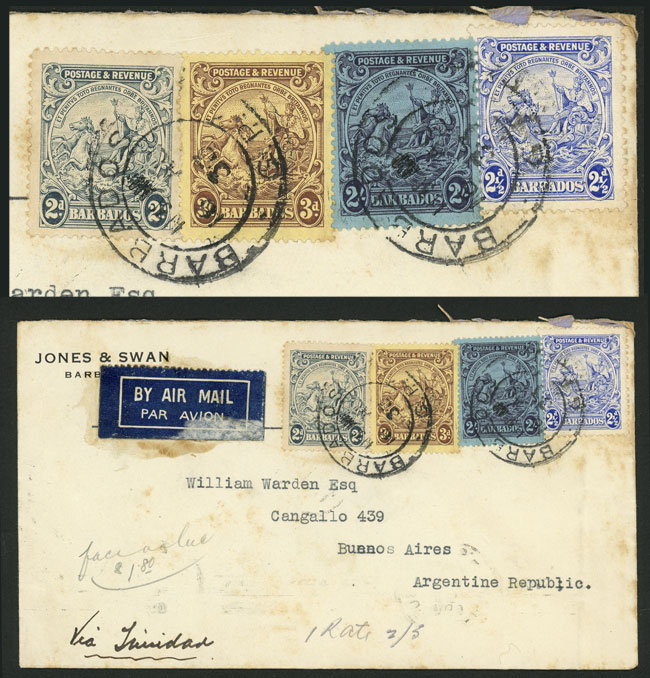 16/AU/1933 Barbados - Argentina, airmail cover with very nice postage including Scott 169 + 170a (perf 13½x12½) + 172 + 177, on back arrival mark of Buenos Aires 25/AU, very attractive! (Image) (Image-02)
