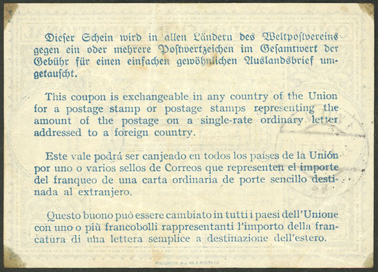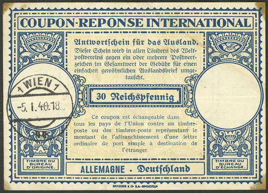 International reply coupon (IRC) of Germany, value 30Pg., with cancel of WIEN applied on 5/JA/1940, with small stains in the corners, else VF!