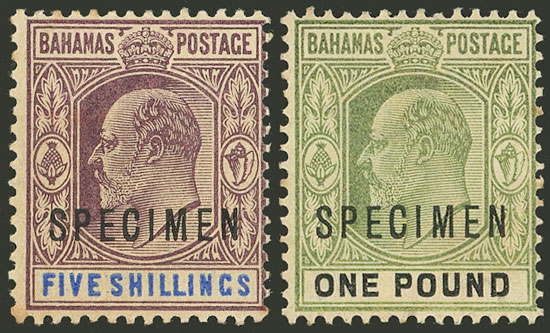 43, 1902 Edward VII 5S. and 1£, both with SPECIMEN overprint, the former with original gum, the other one without gum, VF! (Image)