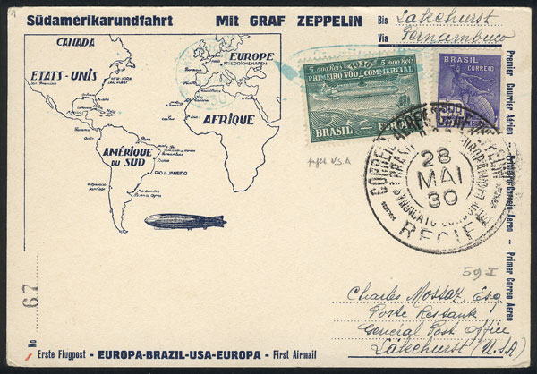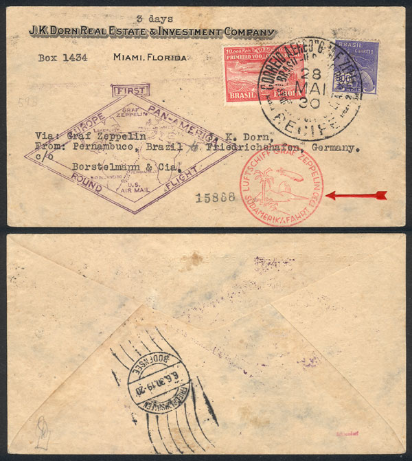 franked with 10,500 Reis, sent from Recife to Germany on 28/MAY/1930, with German (rose red) and American (violet) special handstamps, Friedrichshafen arrival backstamp of 6/JUN, VF quality! (Image)