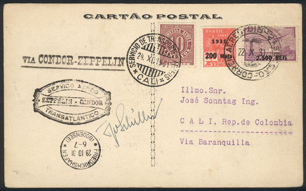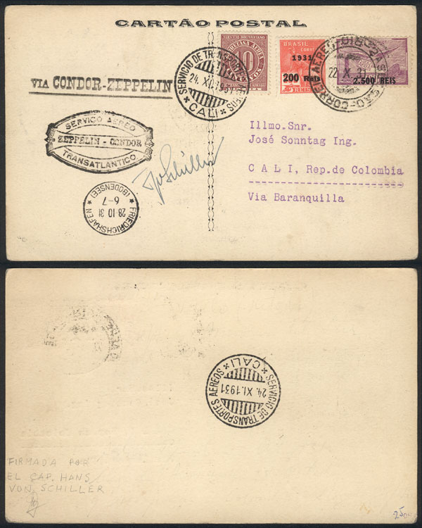 franked with 2,700 Reis, sent from Rio de Janeiro to Cali on 22/OC/1931 via Friedrichshafen, with special handstamp of the flight and SCADTA stamp cancelled in Cali (Colombia) on 24/NOV, interesting, signed by Schiller, VF quality! (Image) (Image-02)