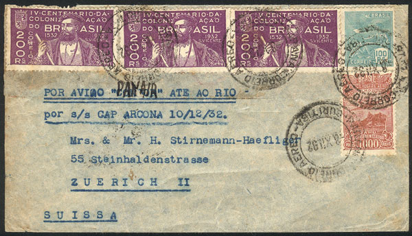 Cover sent from Curitiba to Switzerland on 8/DE/1932, BY AIRPLANE to Rio de Janeiro to reach the steampship Cap Arcona on 10/DE, and from there via ship to its final destination, VF and interesting! (Image) (Image-02)