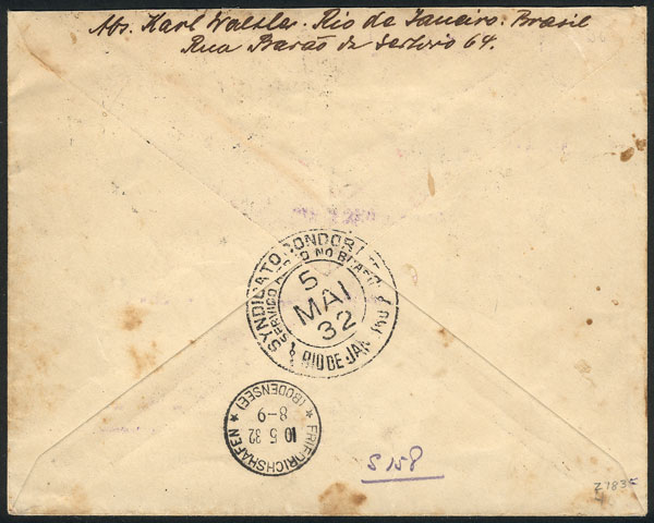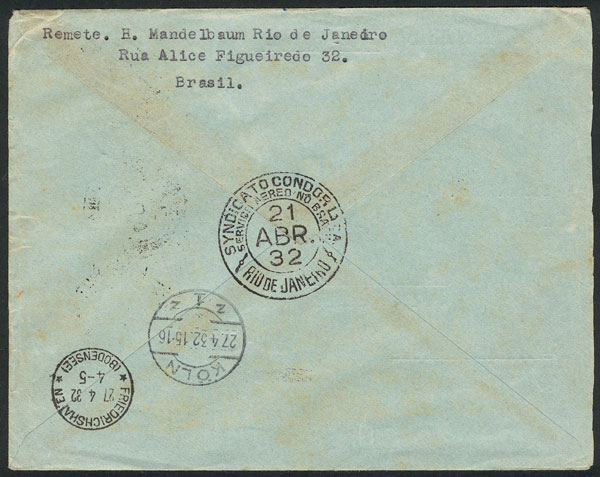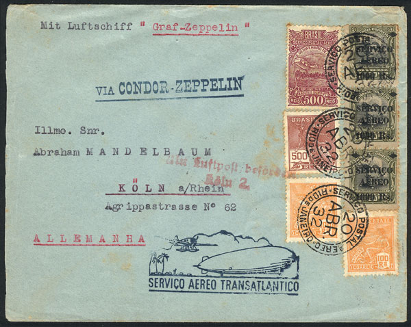 20/AP/1932 Rio de Janeiro - Germany, via ZEPPELIN: Cover with special blue handstamped cachet of the flight, with transit and arrival backstamps, minor defects, very nice! (Image) (Image-02)