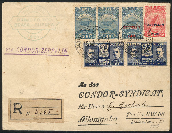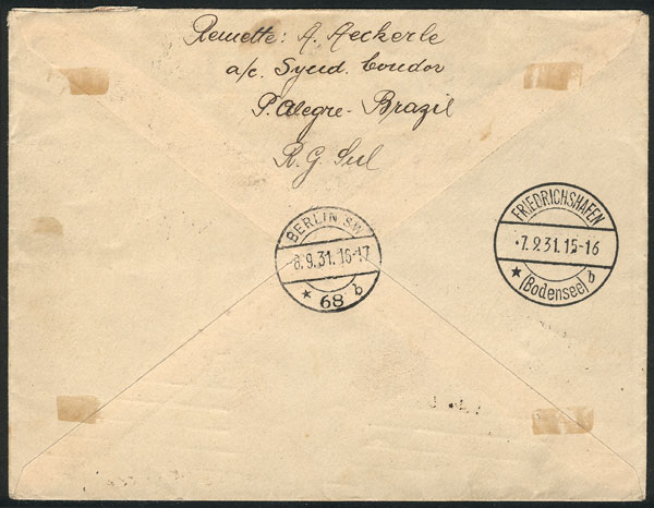31/AU/1931 Porto Alegre - Germany, via ZEPPELIN: Registered cover with nice postage, with Friedrichshafen arrival backstamp of 6/SE, VF quality!