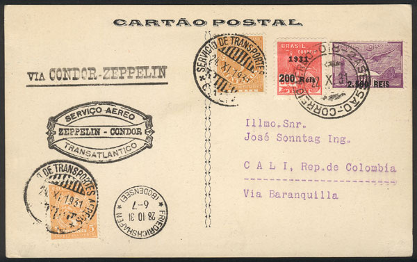 with mixed postage Brazil-Colombia sent from Rio to Colombia on 22/OC/1931 on flight that combined the services of ZEPPELIN and SCADTA, with transit cancel of Friedrichshafen 28/OC and Cali arrival 24/NO, excellent quality! (Image) (Image-02)