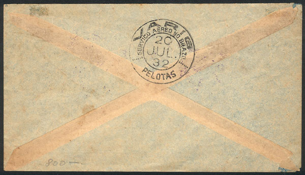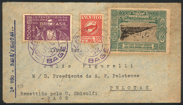 20/JUL/1932 BAGÉ - Pelotas, first flight by VARIG, cover with good postage and beautiful cinderella of Porto Alegre, VF! (Image) (Image-02)
