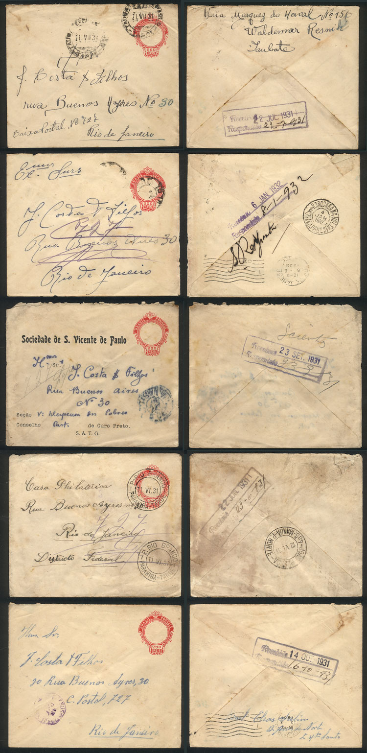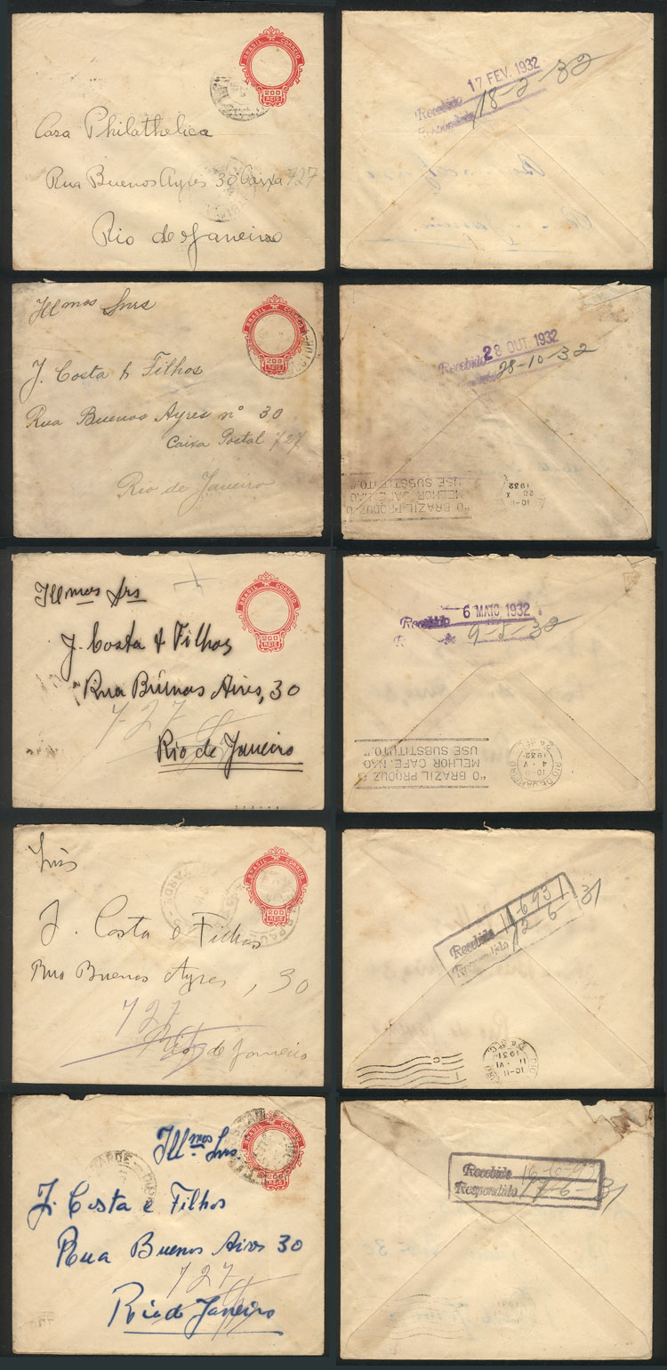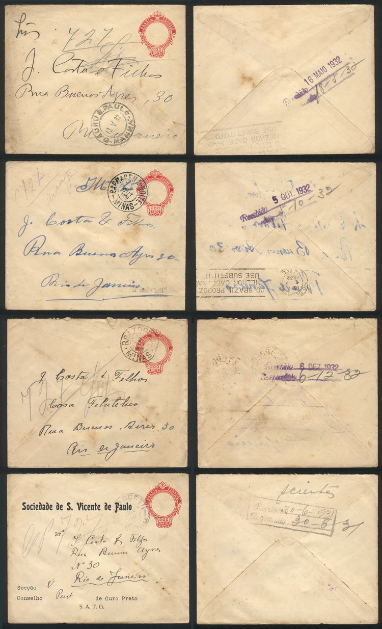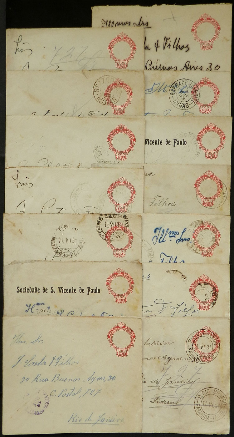 RHM.EN-78, 14 stationery envelopes (with watermark) used between 1931/32, with interesting postmarks: Baurú S. Paulo, Barbagena, Rio Branco, etc. RHM catalog value for 14 used postal stationeries: 180Rs. x14 = 2,500+ Rs., low start! (Image) (Image-02)
