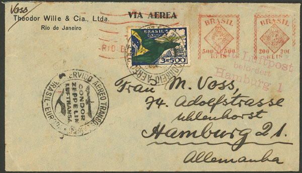 MIXED POSTAGE, STAMP ADDED DUE TO INSUFFICIENT POSTAGE: Airmail cover sent from Rio to Germany on 2/MAY/1934, with meter postage for 700Rs. (insufficient), and so later it received a postage stamp of 3,500Rs. to pay the Lufthansa rate,