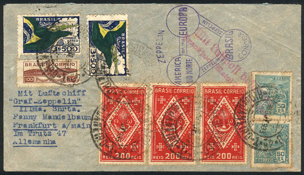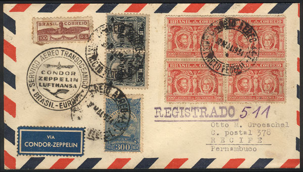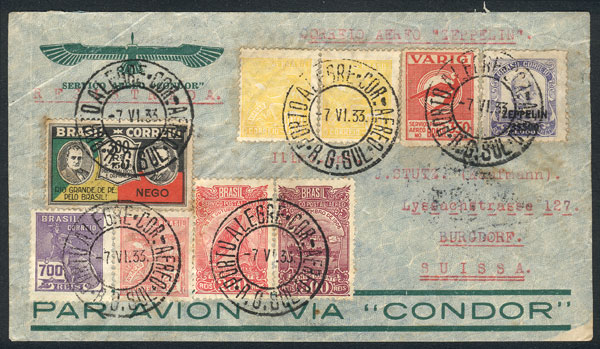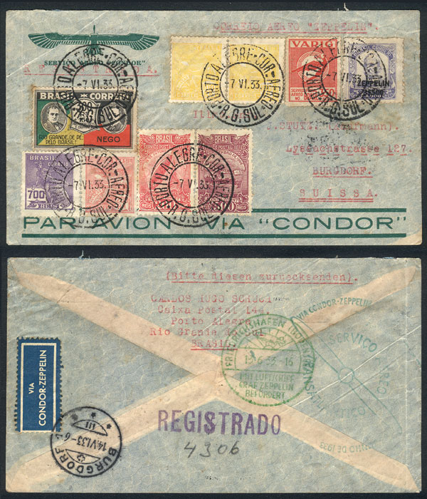 Registered cover franked with nice multicolored postage, sent from Porto Alegre to Switzerland on 7/JUN/1933, with special handstamps, Friedrichshafen transit and arrival on reverse, VF quality! (Image) (Image-02)