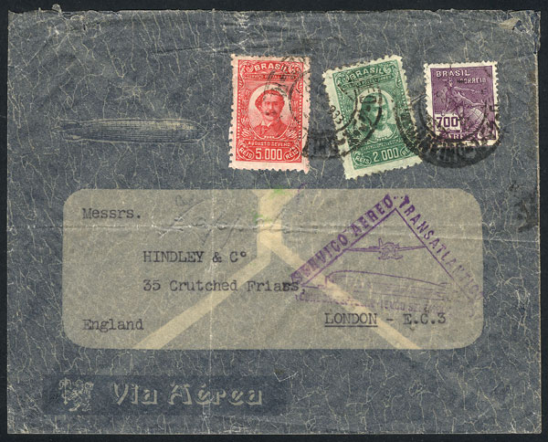 7/SE/1933 Rio de Janeiro - England, via ZEPPELIN: Cover with special violet triangular cachet, and Friedrichshafen arrival backstamp in green (light strike), VF! (Image) (Image-02)