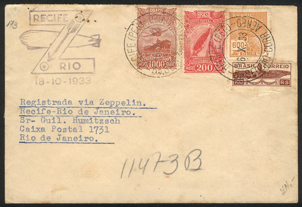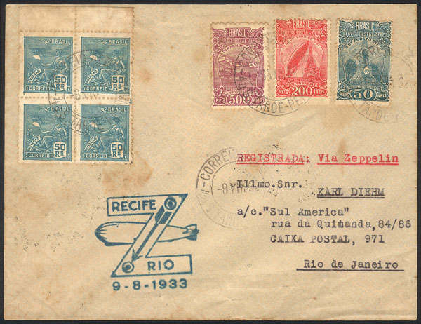 9/AU/1933 Recife - Rio de Janeiro, via ZEPPELIN: Cover with special cachet of the flight, nice multicolored postage and arrival backstamp, fine quality!