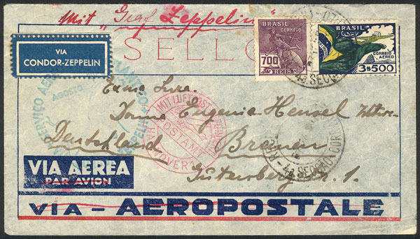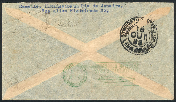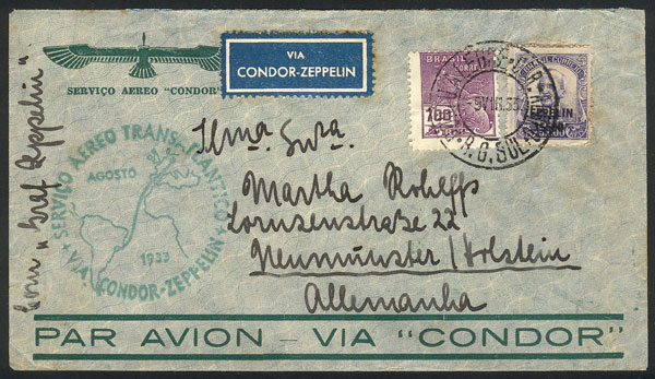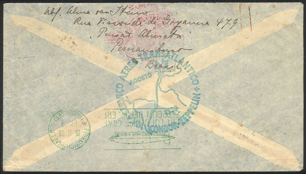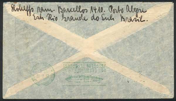 Cover flown by ZEPPELIN, sent from Porto Alegre to Germany on 9/AU/1933, with special green handstamp of the flight and arrival mark of Friedrichshafen 15/AU, VF quality! (Image) (Image-02)