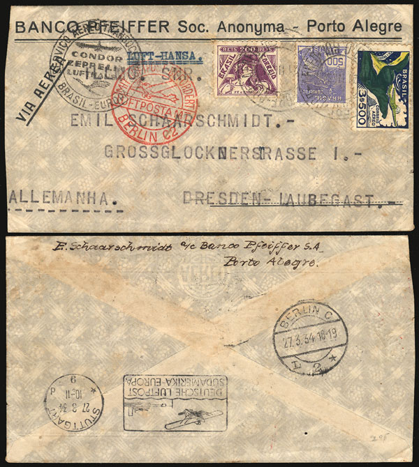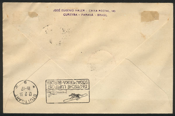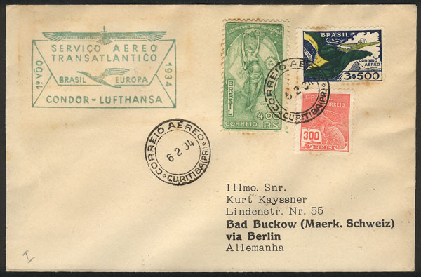 6/FE/1934 Curitiba - Germany, first Condor-Lufthansa flight of the year, with special green handstamp, arrival backstamp of Stuttgart for 12/FE, VF!