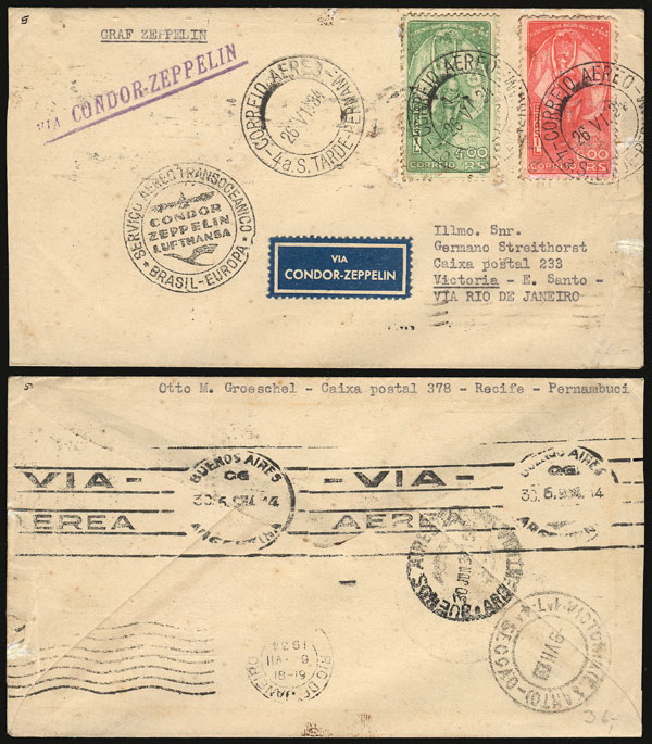 26/JUN/1934 Pernambuco - Victoria, by ZEPPELIN (via Rio de Janeiro), cover with nice commemorative postage, with BUENOS AIRES TRANSIT of 30/JUN and Victoria arrival backstamp of 9/JUL, very interesting! (Image)