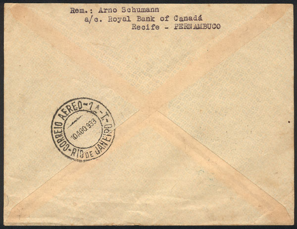 16/OC/1933 Recife - Rio de Janeiro, via ZEPPELIN: Cover with special violet cachet, and arrival backstamp of 19/OC, VF! (Image) (Image-02)