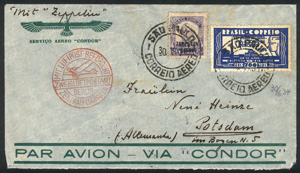 Cover flown by ZEPPELIN, sent from Sao Paulo to Germany on 30/JUN/1934, with arrival backstamp of Friedrichshafen for 6/JUL, VF quality! (Image) (Image-02)