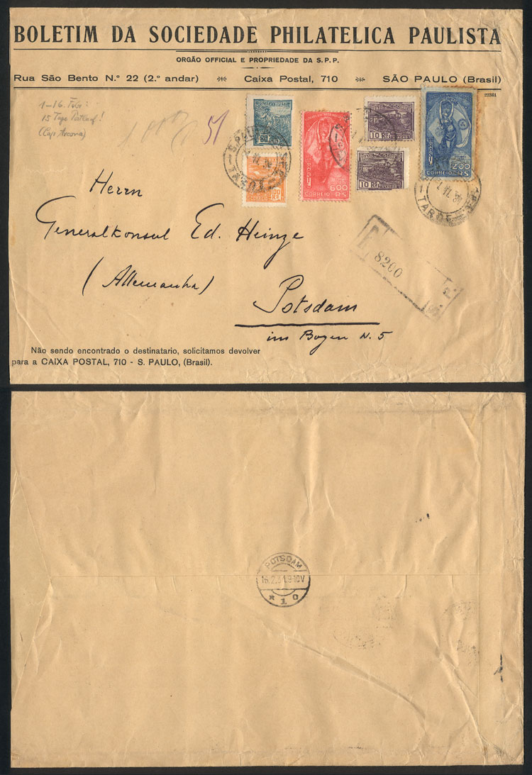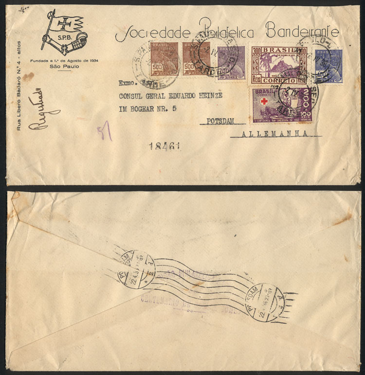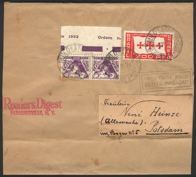 Wrapper for printed matter sent from Sao Paulo to Germany on 3/AP/1934 franked with 600Rs, VF quality, rare! (Image) (Image-02)
