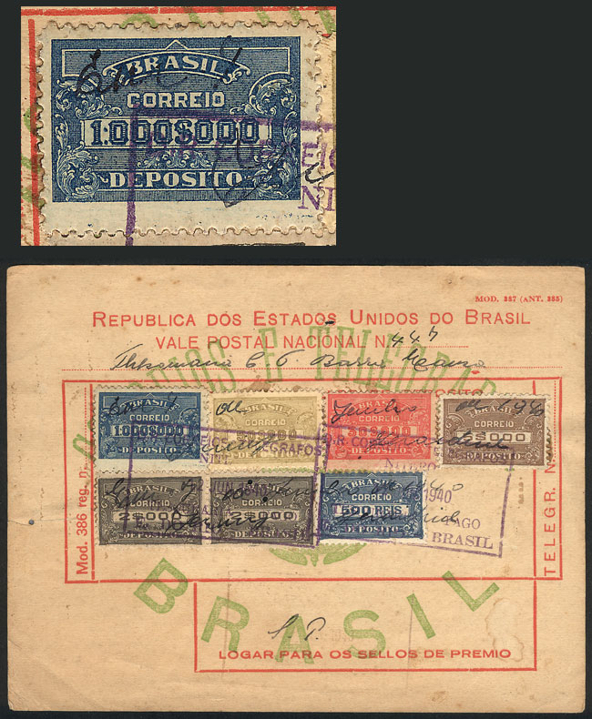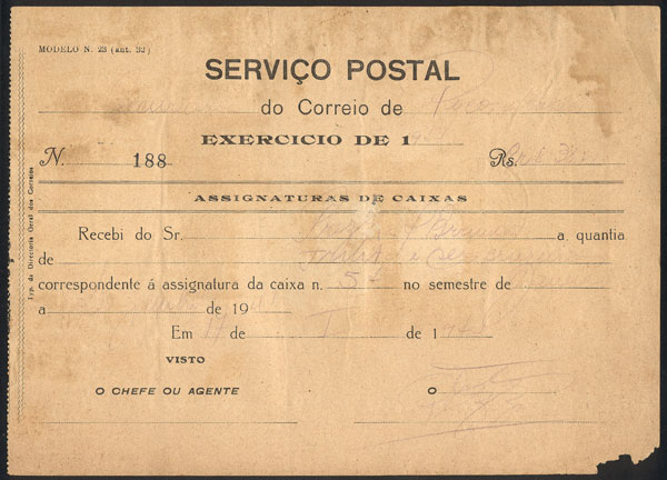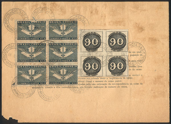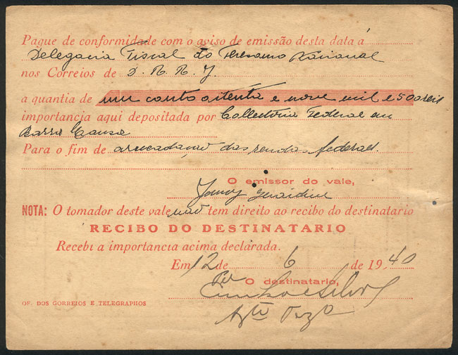 Receipt of payment for PO box of 17/JA/1944, with spectacular postage on reverse of commemorative stamps combining 2 currencies: CR$ and Réis, VF!