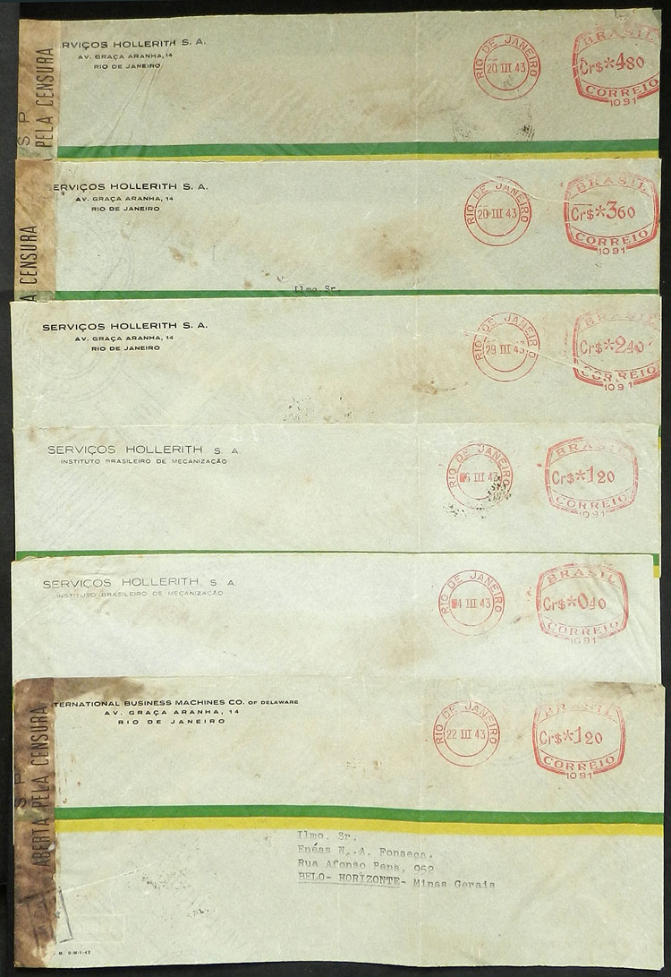 sent from Rio de Janeiro to Belo Horizonte in MAR/1943, all with corner card: "SERVI€OS HOLLERITH S.A. - INSTITUTO BRASILEIRO DE MECANIZA€AO", manufacturers of the franking machines that were used on the covers, on a test basis, with