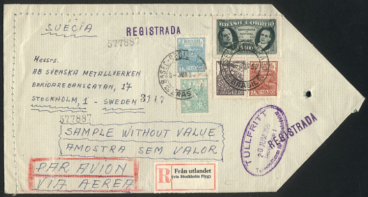 Registered airmail cover containing SAMPLES WITHOUT VALUE sent from Sao Paulo to Sweden on 9/JUN/1950, interesting postage, excellent quality!