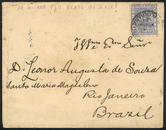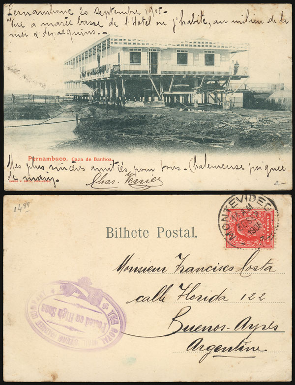 PERNAMBUCO: Caza de Banhos, editor Ramiro M. Costa, franked with British stamp of 1p. and posted at sea from British ship to Buenos Aires, with Montevideo datestamp for 30/SE/1905, VF! (Image)