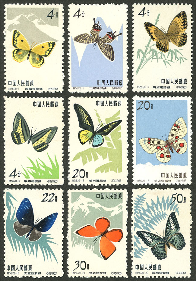 Sc.661/3 + 665 + 676/680, 1963 Butterflies, 9 values of the set of 20, mint without gum (as issued), VF quality! (Image)
