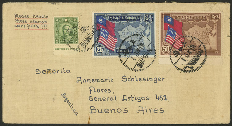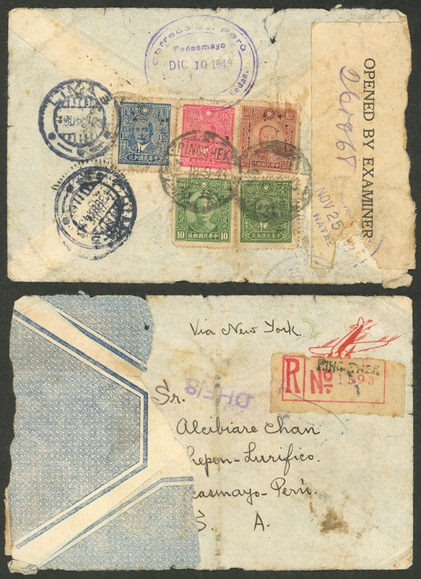 Registered airmail cover sent from PINGSHEK to Peru on 17/SE/1943 franked on back with $17.60. On back it bears transit marks of Natal (25/NO), Lima (8 and 9/DE), and arrival of Pacasmayo 10/DE, with large defects (part of the front is