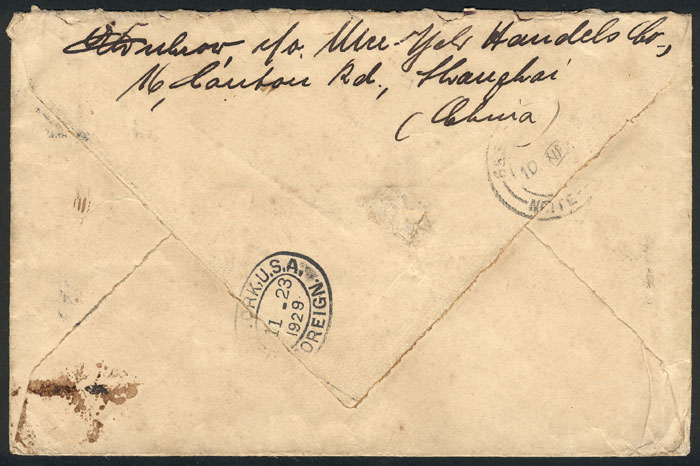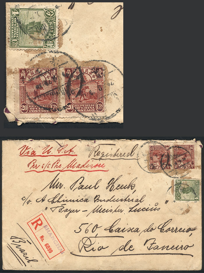 Registered cover sent from Shanghai to Rio de Janeiro (Brazil) in NO/1929 via New York, nice postage, VF quality, rare destination! (Image) (Image-02)