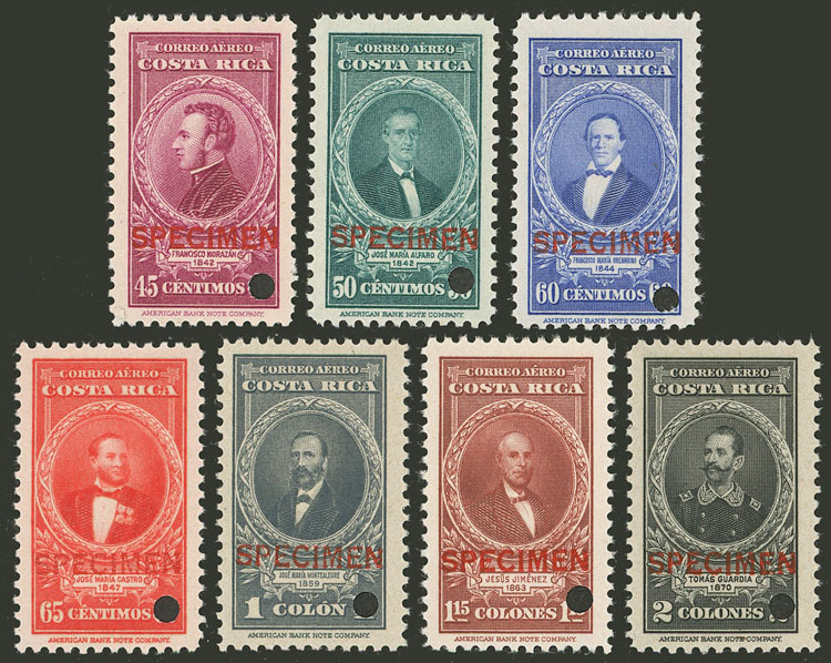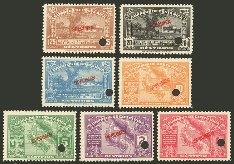 126/132, 1924 Nicoya, the set of 7 values with SPECIMEN overprint and punch hole, excellent quality! (Image)