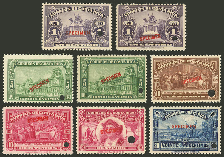 116 + 119A + 120 + 120A + 121 + 122, 1923/6 Pan-American Postal Congress (Colombus), 8 values with SPECIMEN overprint and puch hole, of the 1c. we include two different overprints and of the 5c. two different shades, excellent lot! (Image)